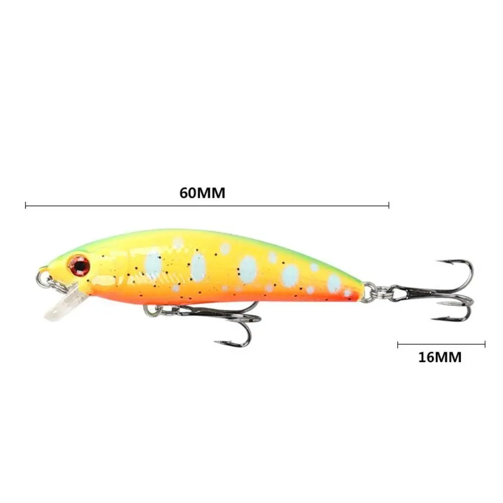 Tipo: cebo Artificial Material: ABS Tipo: 15 tipos Longitud única: 6cm Peso único: 5,7g El embalaje incluye: 1 señuelo de pesca Características: 1. Señuelos de pesca para los amantes de la pesca. 2. Maravillosa herramienta de pesca para los amantes de la pesca. 3. Excelente flotabilidad y sensibilidad. 4. Acero inoxidable duro de alta calidad, con púas, muy afilado