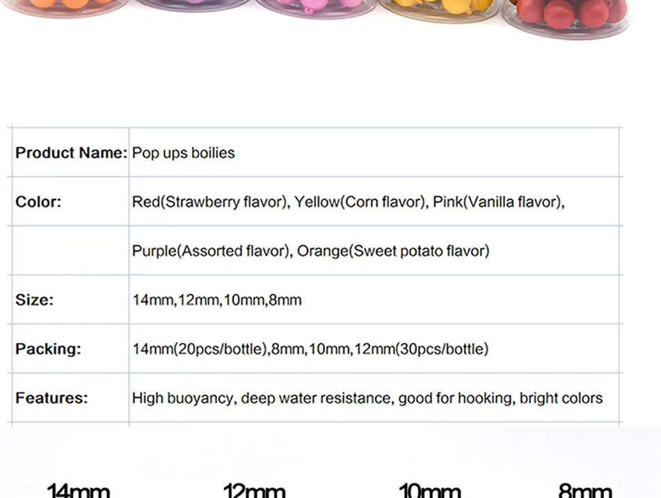 Descripción del producto Gran flotabilidad, resistencia al agua profunda, buen gancho, colores brillantes. Tamaño: 14 mm, 12 mm, 10 mm, 8 mm Embalaje: 14 mm (20 piezas/botella), 8 mm, 10 mm, 12 mm (30 piezas/botella) Cantidad: 1 caja