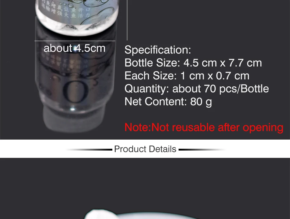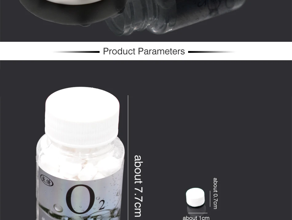 Descripción del producto100 nuevo y de alta calidadLas tabletas de oxígeno ayudan a liberar oxígeno en una espuma fina.Estas tabletas liberarán oxígeno al agua durante 3 a 6 horas.La ayuda para matar gérmenes reduce el estrés de los peces durante el transporte, alta tasa de supervivencia.Y para reducir las enfermedades.Ideal cuando se produce una pérdida de energía eléctrica o cuando se transporta sus peces.Le permitirá mantener a los peces vivos sin el uso de una bomba de aire.Suministre oxígeno en aguas con bajo contenido de oxígeno/transporte peces/agües de peces para acuariosComponentes incluidosTamaño de la botella: 4,5 cm x 7,7 cmCada tamaño: 1 cm x 0,7 cmCantidad: alrededor de 70 unidades/botellaContenido neto: 80 gramos1 botella x tabletas de oxígenoNota: No reutilizable después de abrir