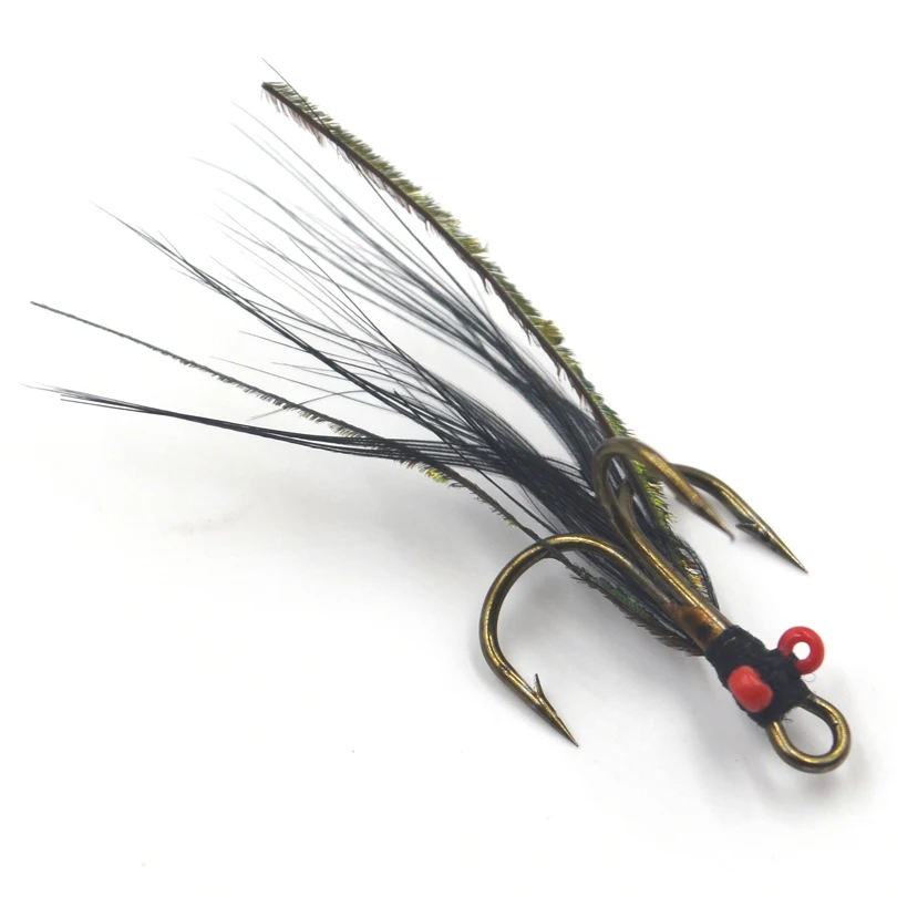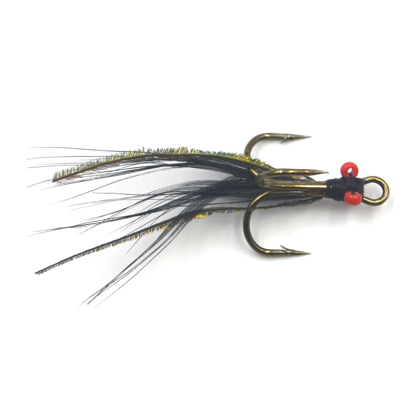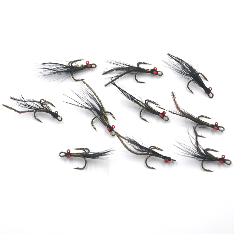 MNFT, 10 Uds. En caja, pesca con mosca, tres anzuelos, moscas, ojos rojos, plumas negras, plumas de pavo real, mosca húmeda, cebo de ninfa, señuelos receptores de moscas