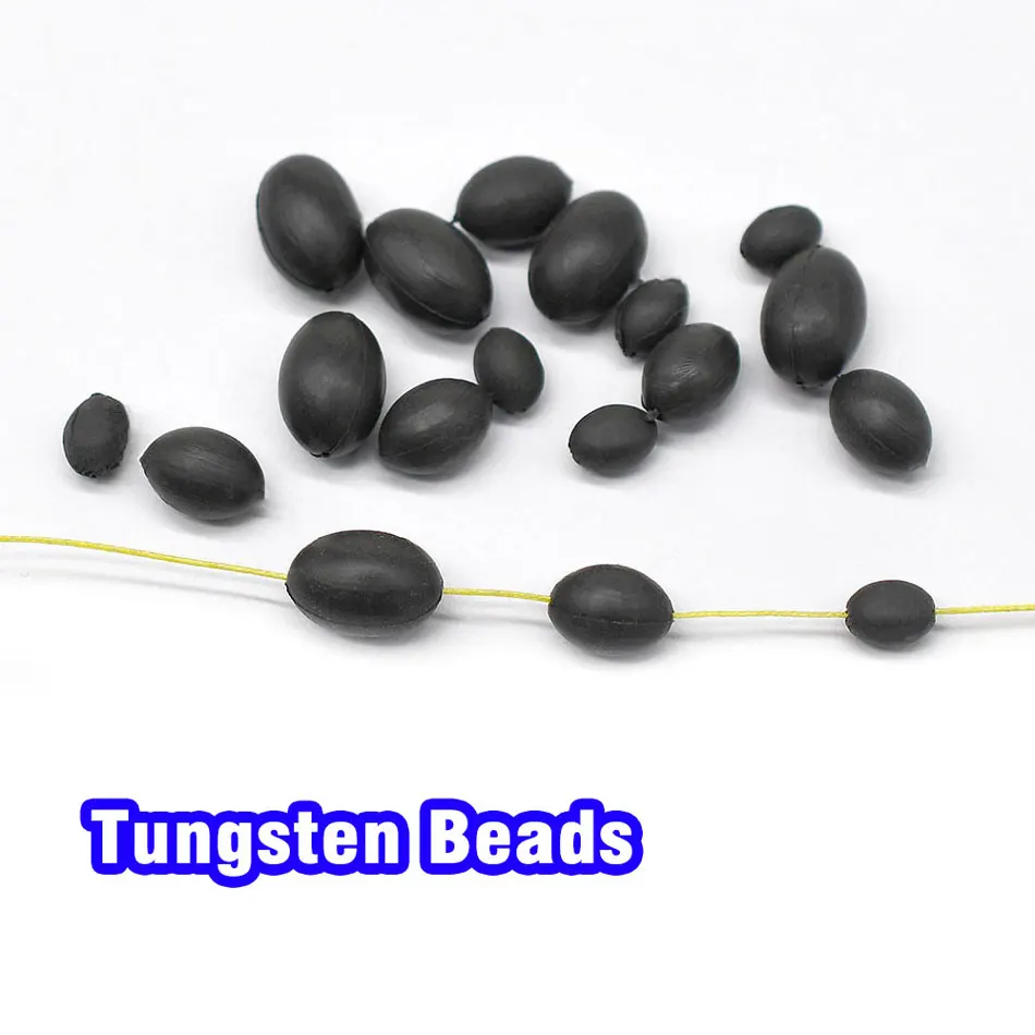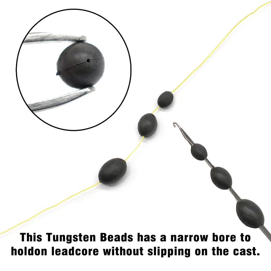 Cuentas ovaladas de tungsteno ultrapesadas para usar con Leadcore. Tiene un orificio estrecho para sujetar el número sin deslizarse sobre el yeso.