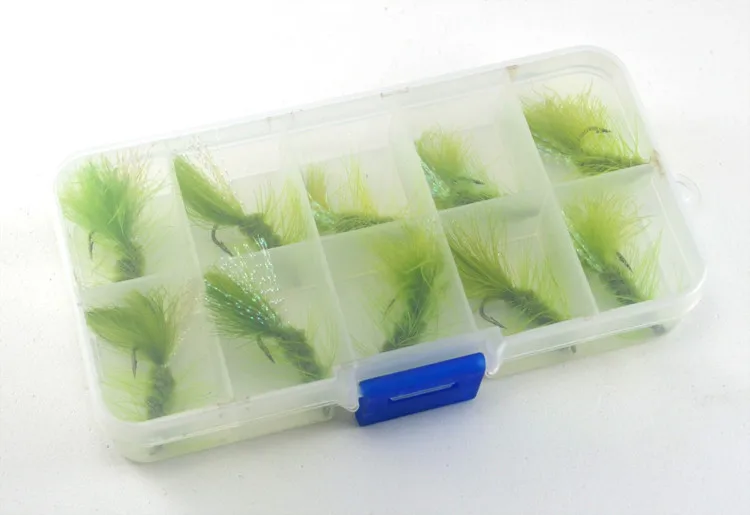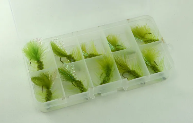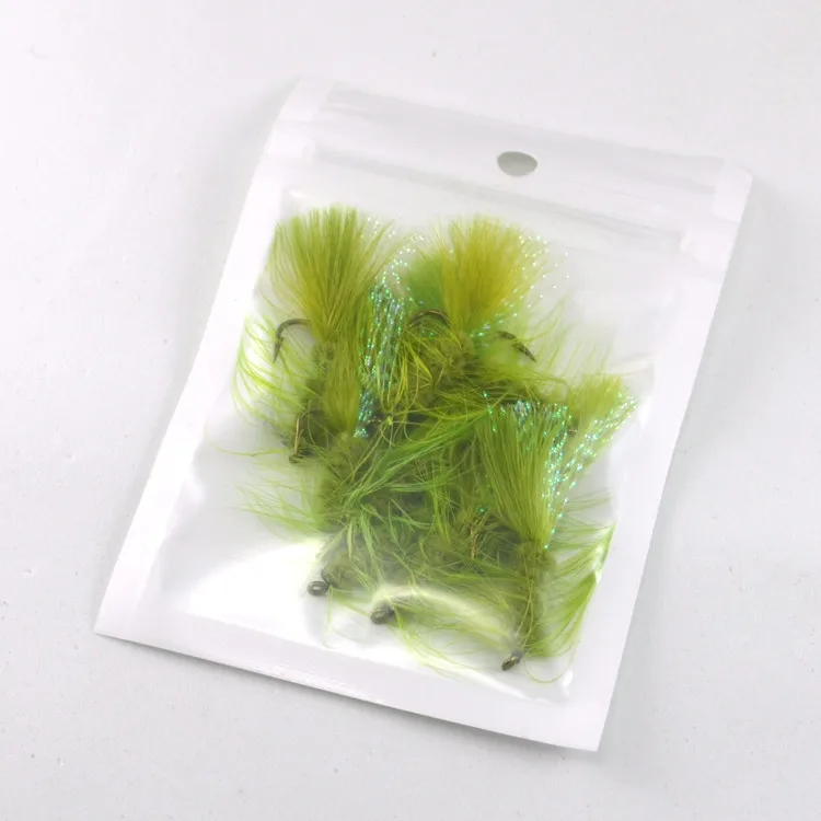 MNFT 10PCS 6 # Señuelo tipo Bugger lanudo de color oliva, trucha, cola de Flashabou, señuelos de pesca con mosca
