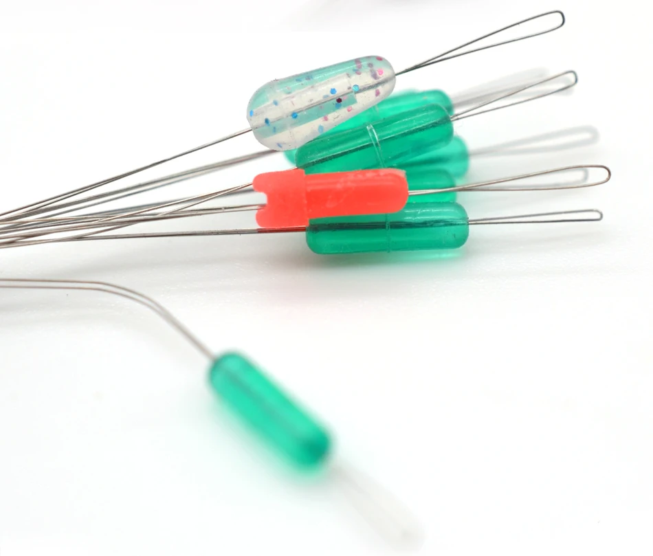 El tapón de pesca está formado por un tapón ovalado de goma Premium con anillo de plástico y un pequeño alambre de metal.