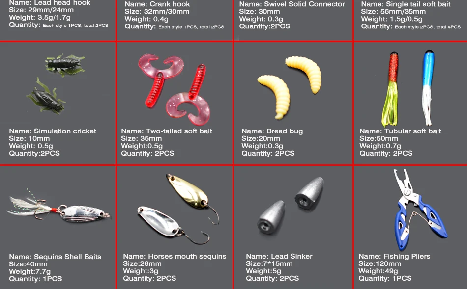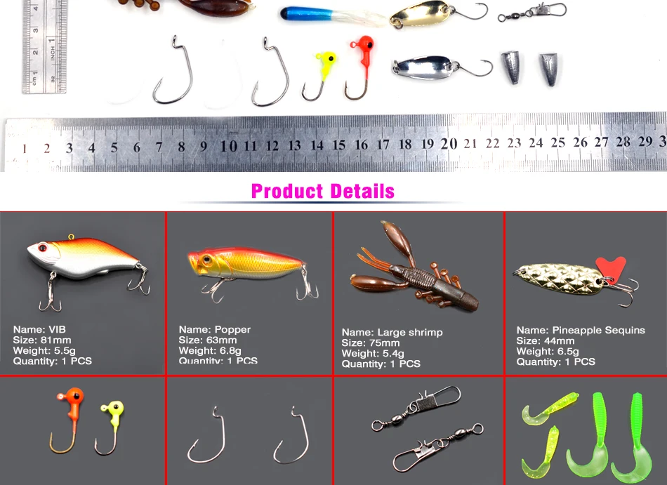 Descripción del productoIncluye cebos de plástico duro, cebos de silicona suave, señuelos de lentejuelas, anillos guía, anzuelos de pesca y otros accesorios, 29 piezas en total.Los señuelos de pesca múltiples le permiten experimentar una pesca de diferentes estilos.La caja de almacenamiento con cada compartimento se abre por separado.Nota: Los colores de los señuelos de pesca dentro de la caja se entregan al azar, pero sus tipos son idénticos a los de las imágenes.Especificaciones:Material: plástico y acero inoxidableTamaño: 29 piezasTamaño del paquete: 70*13*2,7 cmPeso del paquete: 160 gNota: Cuando el cebo es sumergible, la línea de agua semiaflante Mino debajo de la inmersión, la onda del lápiz flota con agua.Componentes incluidos1 * juego de accesorios de pesca1 * caja de almacenamiento