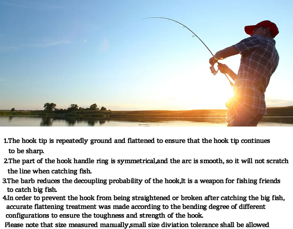 3.La púa reduce la probabilidad de desacoplamiento del anzuelo. Es un arma para que los amigos pescadores capturen peces grandes.4.Para evitar que el anzuelo se enderece o se rompa después de capturar el pez grande, se realizó un tratamiento de aplanamiento preciso de acuerdo con el grado de flexión de las diferentes configuraciones para garantizar la dureza y resistencia del anzuelo.
