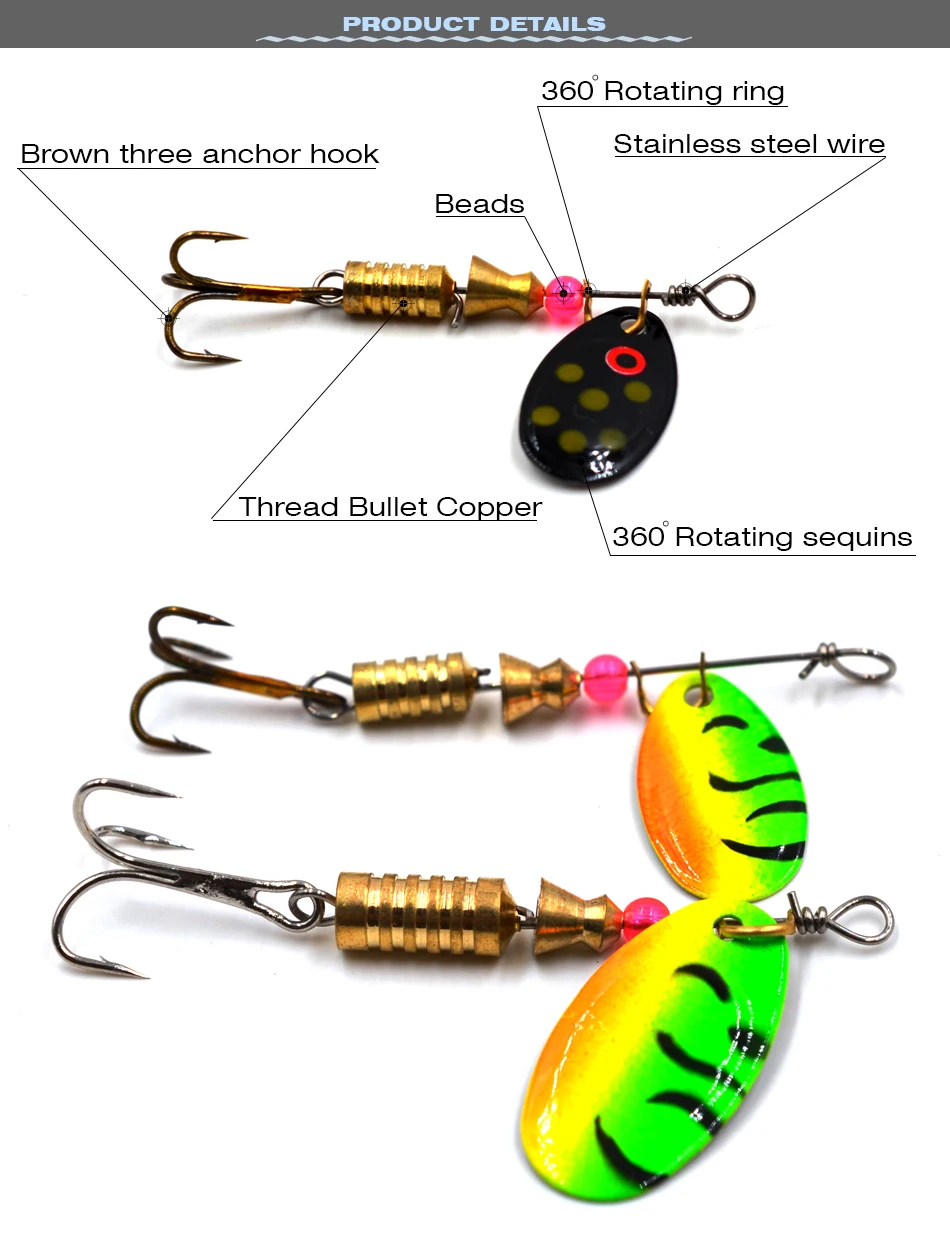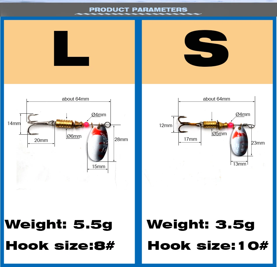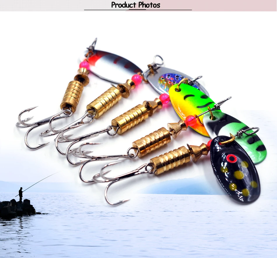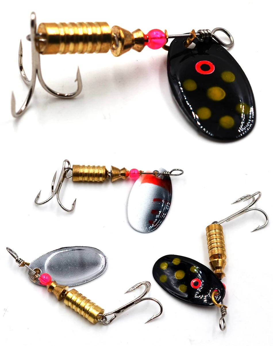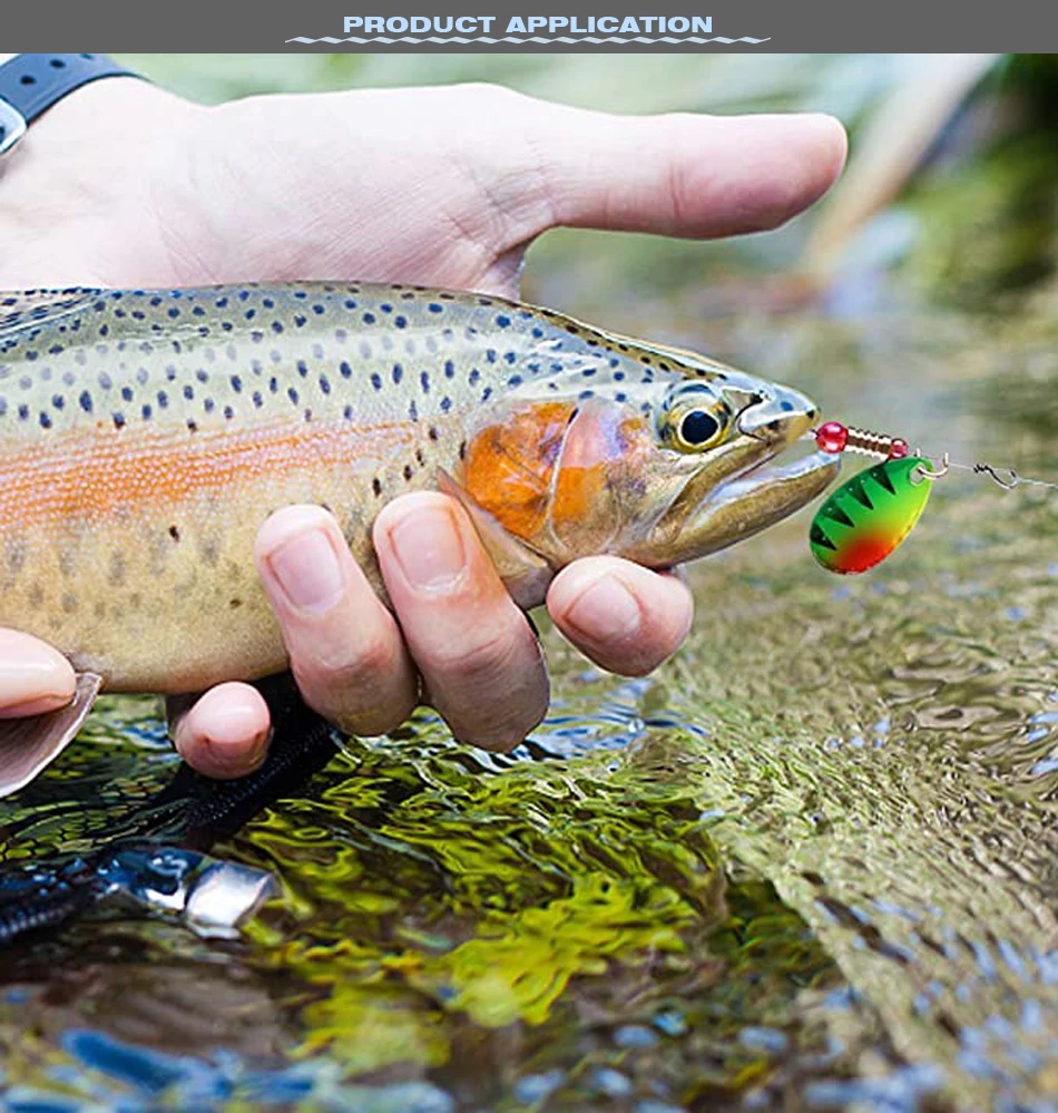 Características: Acciones de natación realistas en el agua.La hoja de primera calidad proporciona flash y vibración continuos.Los hilanderos de pesca están diseñados para la pesca de lubina y la pesca de trucha. Los señuelos de trucha vienen con anzuelos triples afilados con colores brillantes para atraer peces grandes. Los señuelos de pesca Spinners son tanto para agua dulce como salada. Especificación: Material: Metal Cantidad: 10 Uds. Señuelos de pesca Peso: 3,5 g/5,5 g Longitud: aproximadamente 6,4 cm Tamaño del gancho: 8#/10# Embalaje: 10 Uds. Señuelos de pesca/lote