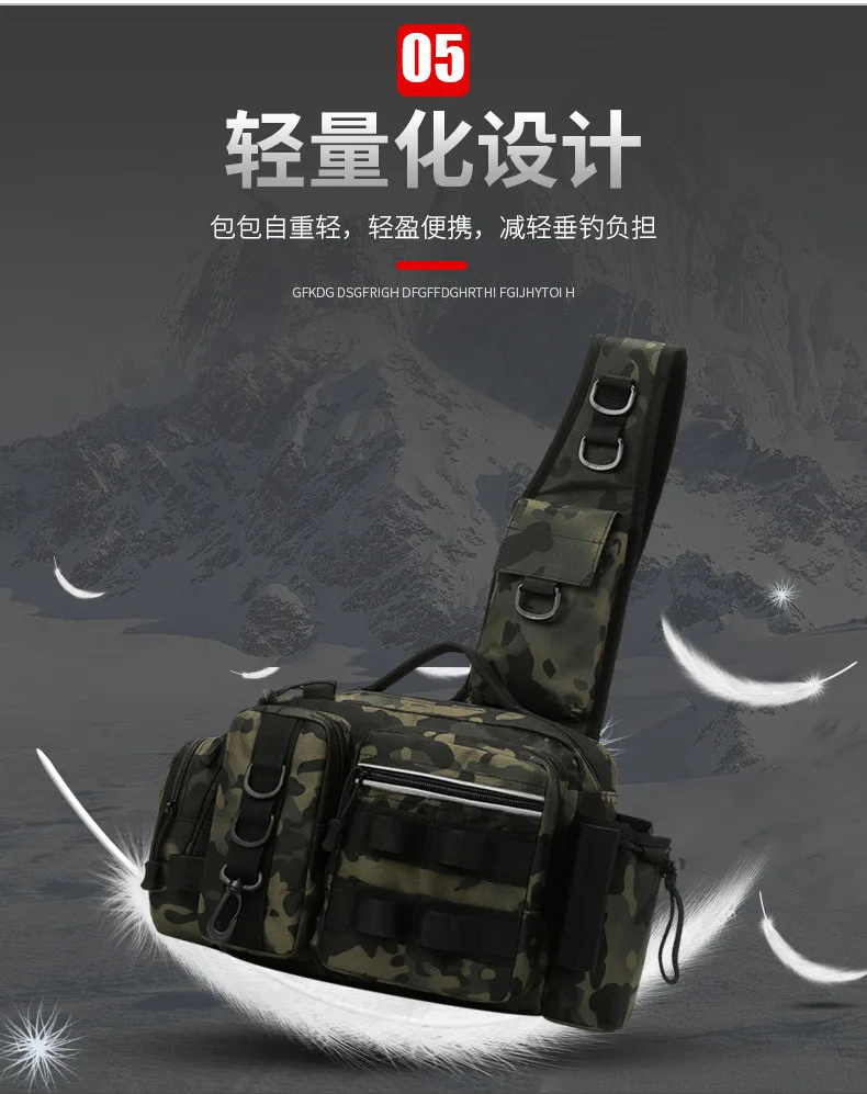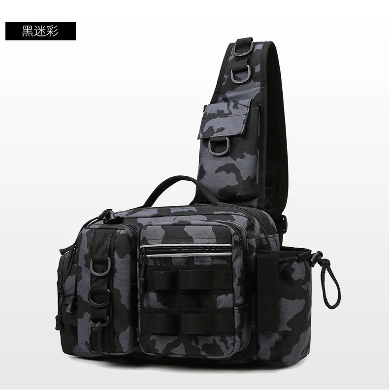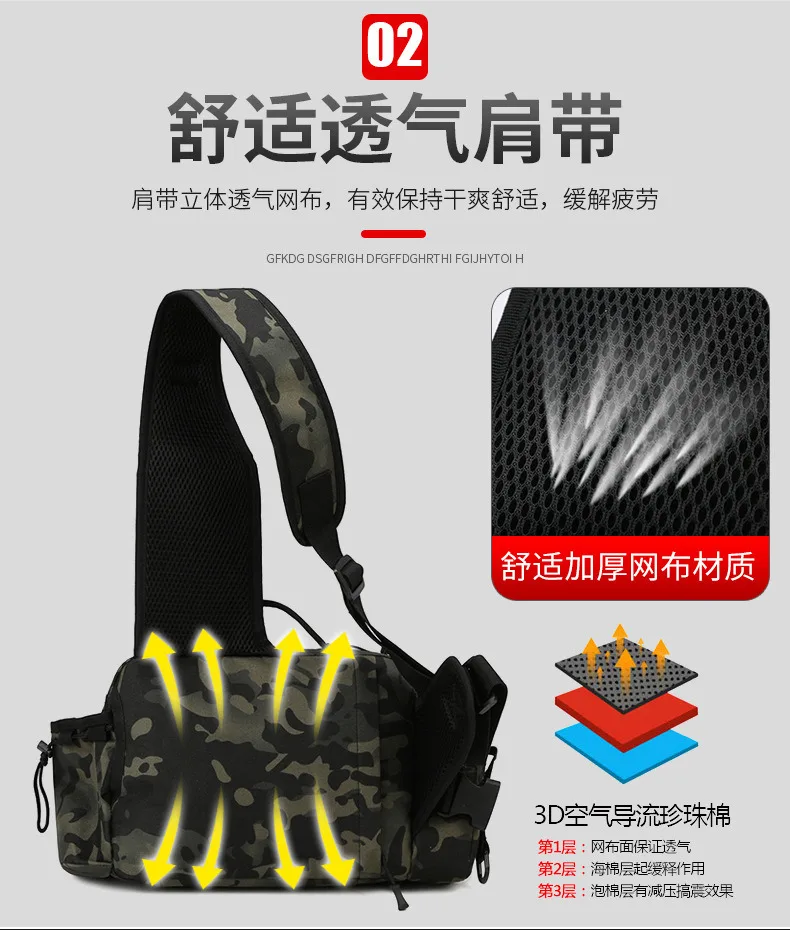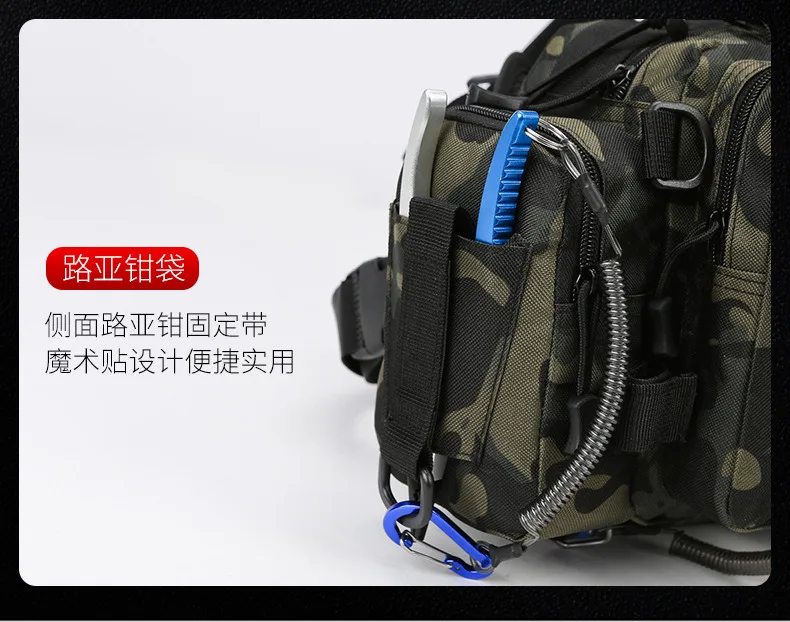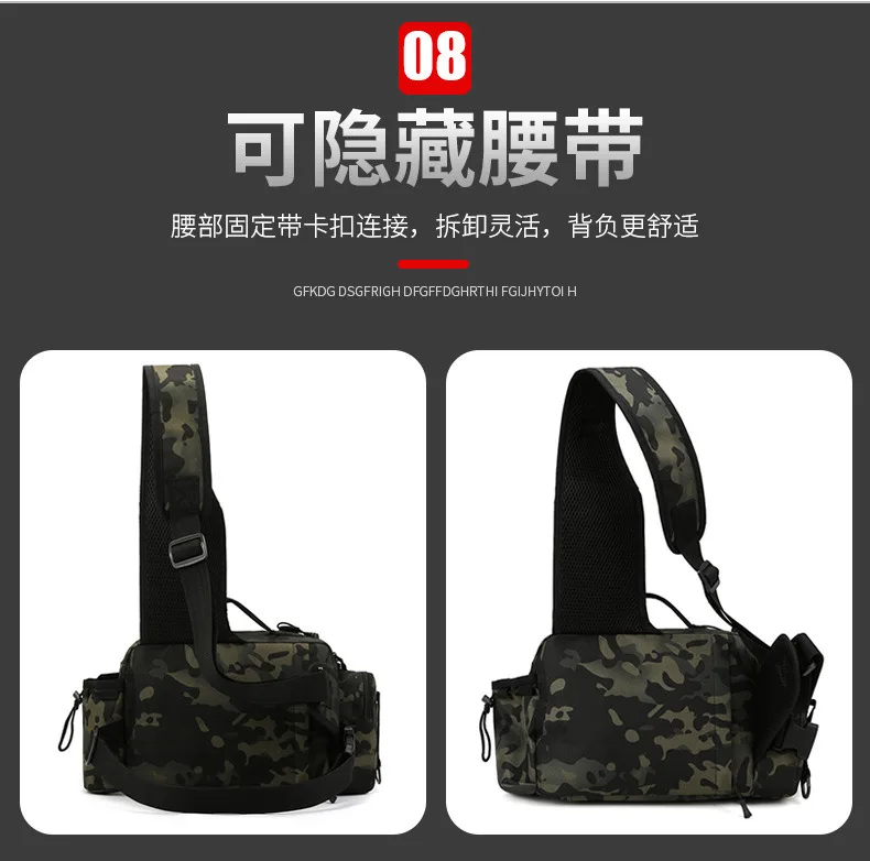 1. Compartimento de almacenamiento de pesca múltiple: Esta bolsa de pesca consta de 5 bolsillos con cremallera, 1 bolsillo para botella de agua y múltiples bolsillos de cierre de velcro para proporcionar un montón de espacio organizativo. El diseño versátil con gran capacidad de bolsillos puede almacenar fácilmente cebo, alicates, línea y otros accesorios que necesita en su vida, como teléfono celular, BILLETERA, llaves, etc.
