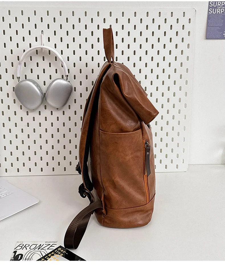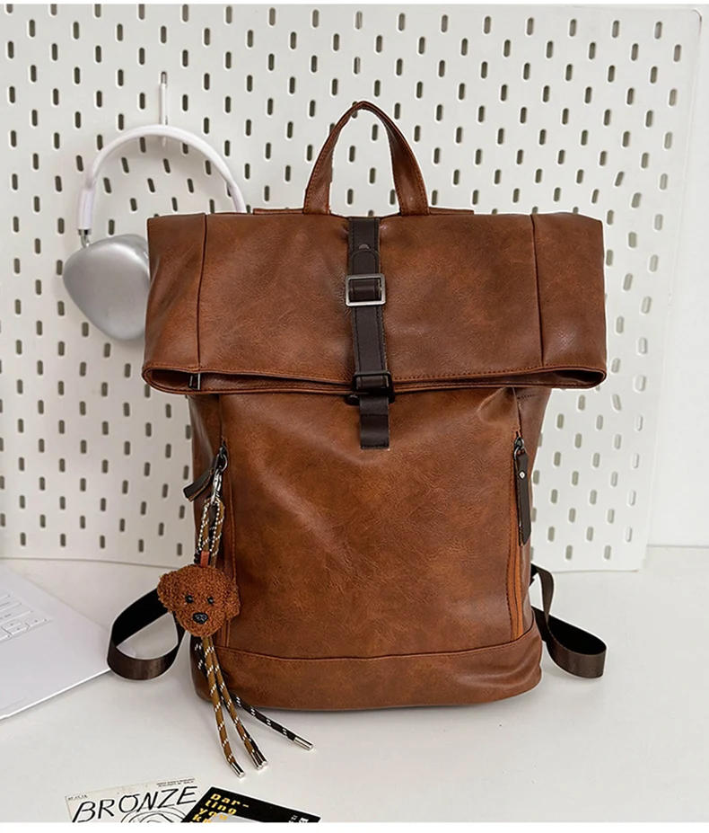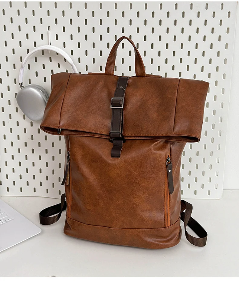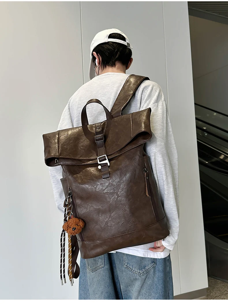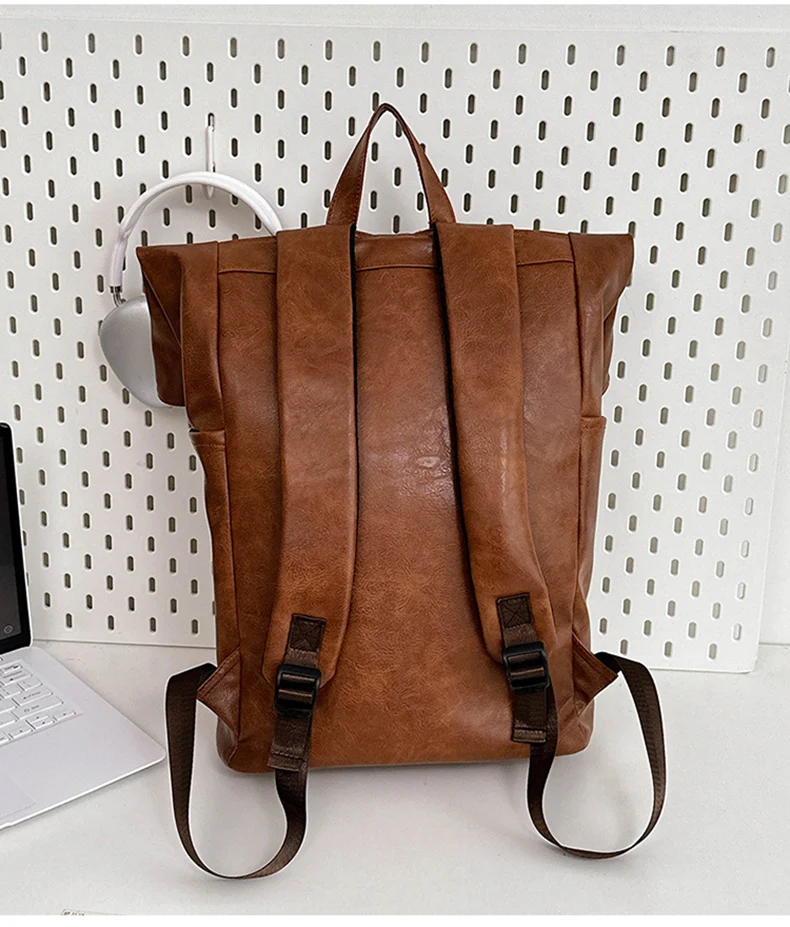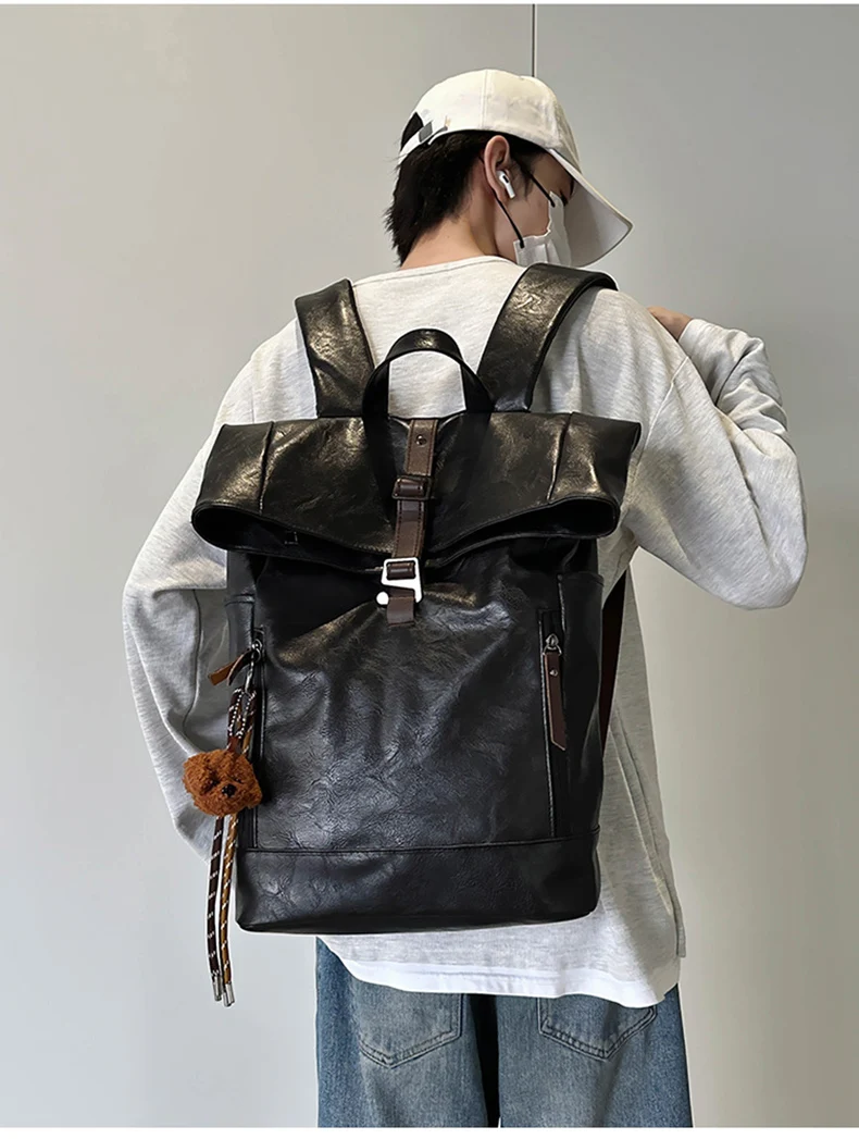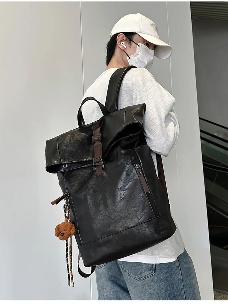 Bolso de hombro de PU, mochila para hombre, bolso de ordenador de gran capacidad, bolso de hombro con boca en rollo para viajes de clase para estudiantes universitarios
