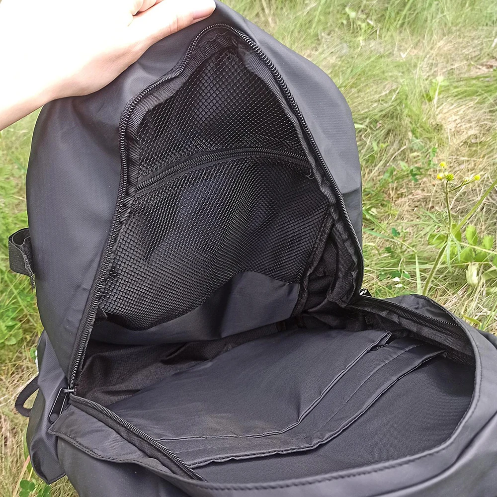 -Bolsillo lateral con capucha y ventana de malla laminada · 2 compartimentos de almacenamiento internos y 1 bolsillo con cremallera ·