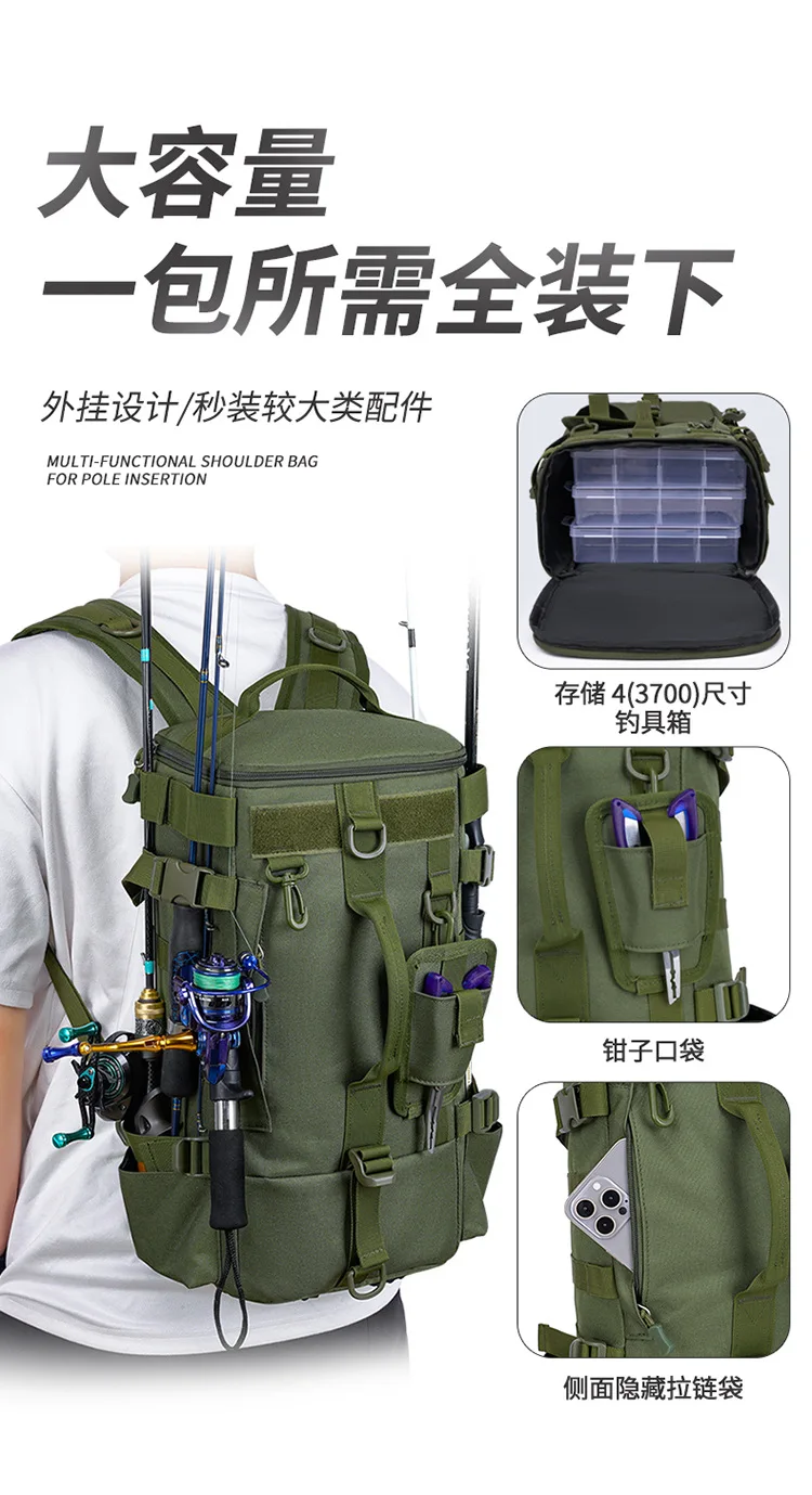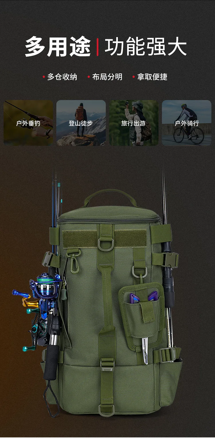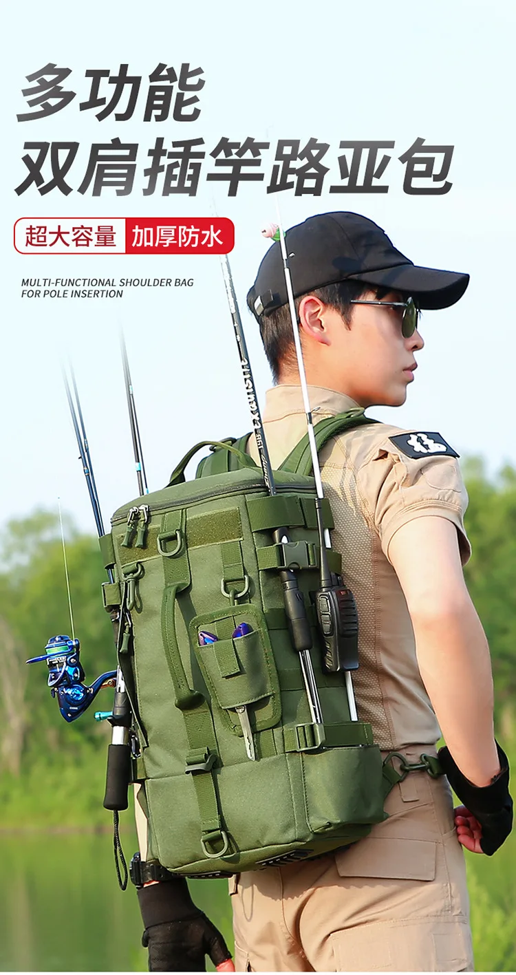Mochila de pesca táctica, bolsa de aparejos con soportes para cañas, almacenamiento de equipos de pescado, Molle, Camping, senderismo, bolsa multifuncional al aire libre