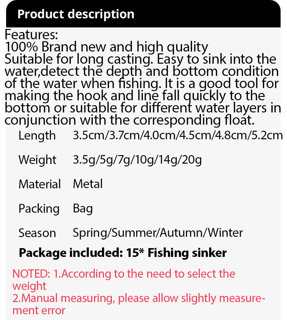 4. Versatilidad de pesca: es una buena herramienta para hacer que el anzuelo y el sedal caigan rápidamente al fondo o adecuado para diferentes capas de agua junto con el flotador correspondiente. La delgada forma de lápiz funciona mejor en rocas, barro y fondos de arena. Es excelente para Lucio, lubina y crappie.