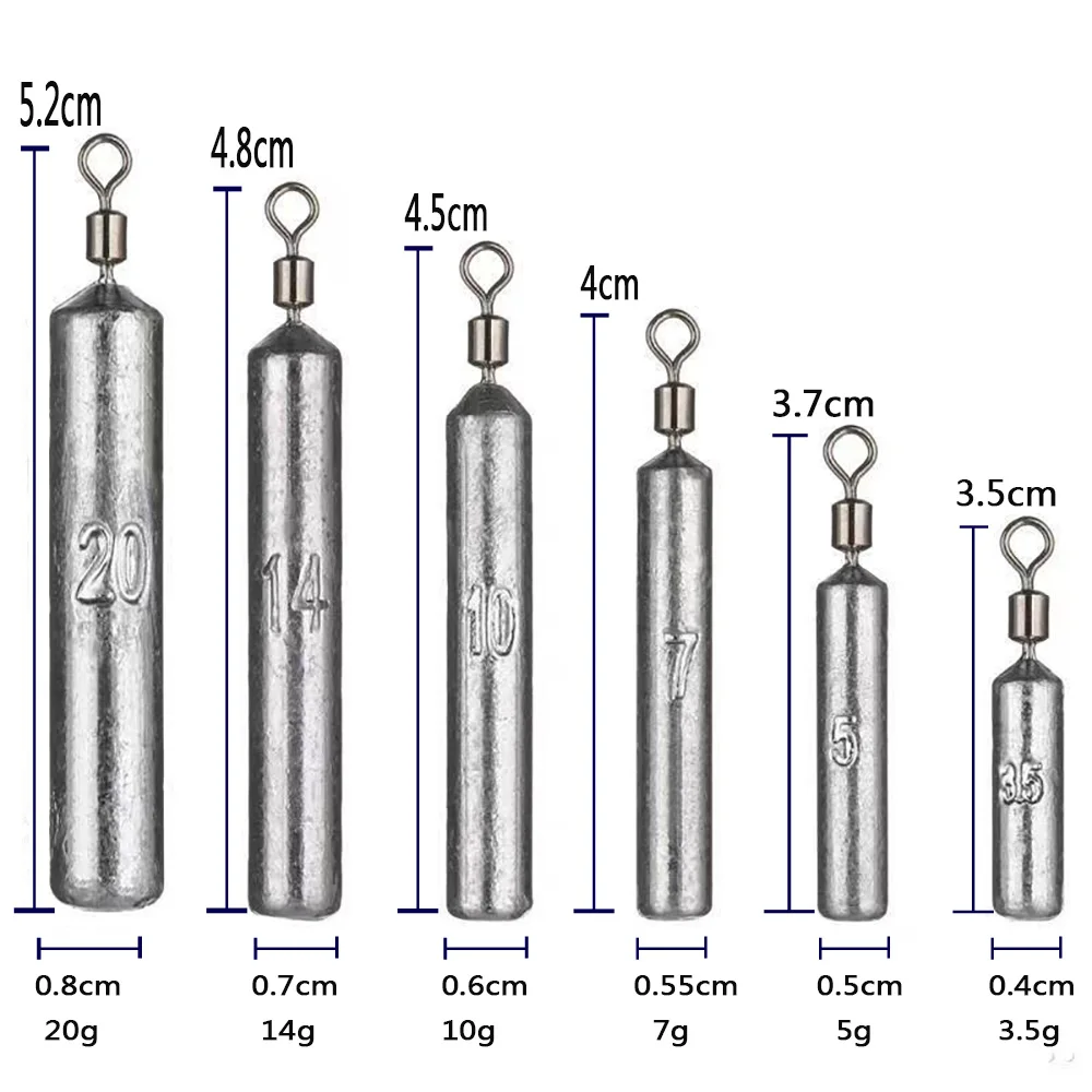 • Fácil de usar:Estas pesas de pesca tienen una forma de bala de tubo conveniente, lo que las hace fáciles de manejar y sujetar a su línea de pesca.