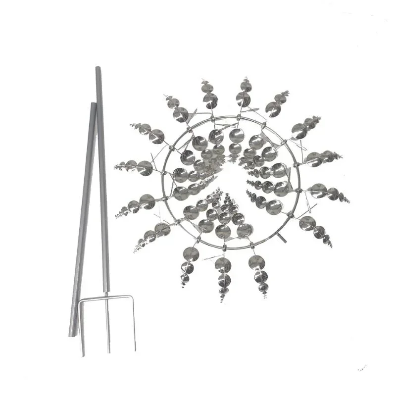 Nombre del producto: molino de viento de metal Material: Metal Color: Plata Longitud total del poste: 70 cm Diámetro del molino de viento: 30 cm Tamaño: como se muestra en la imagen. Categoría: Carillón de viento