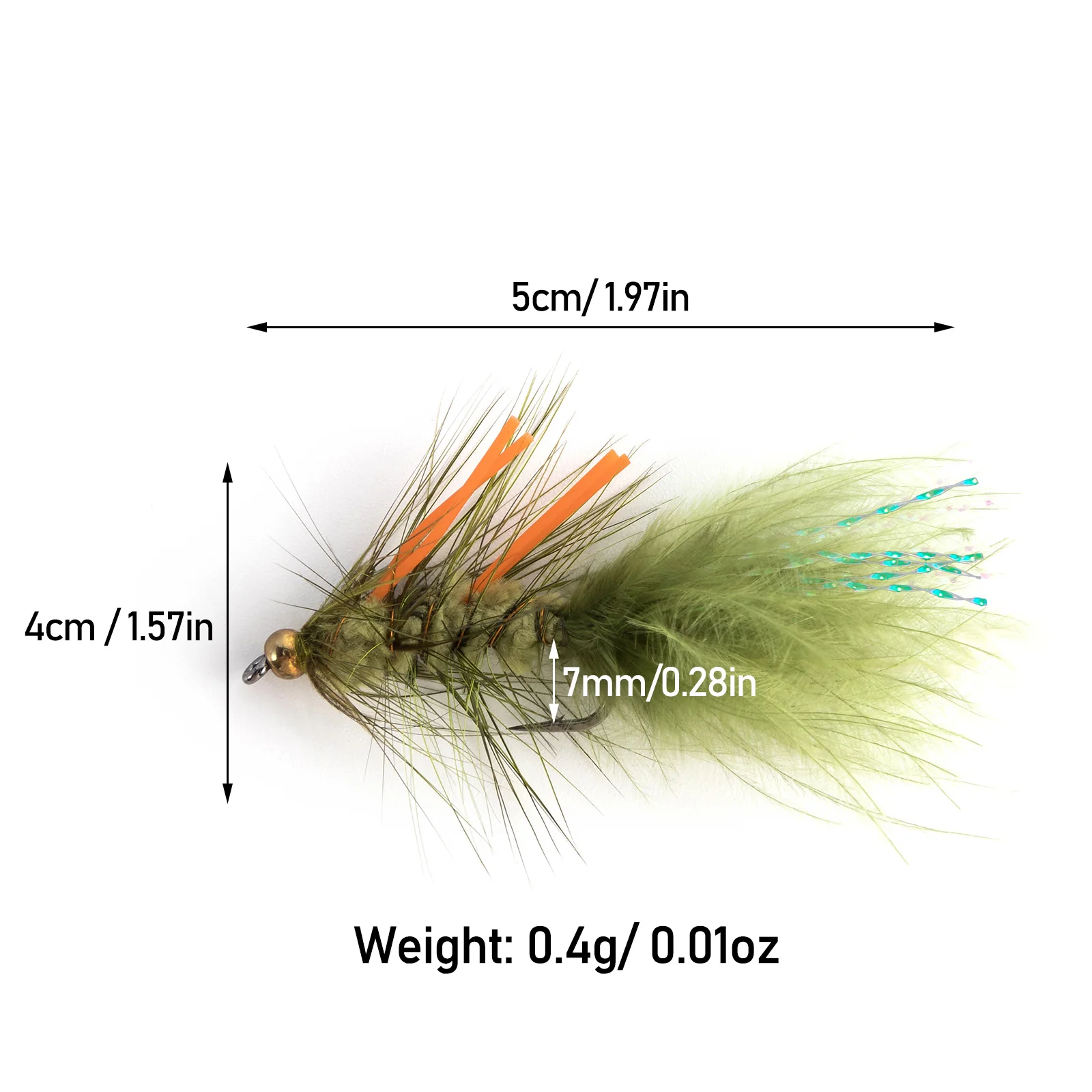 Imitación realista de insectos: diseñadas con cuerpo de pelos peludos, patas de goma y cabeza de cuentas doradas, estas moscas lanudas producen un perfil de insecto natural y una acción ondulante realista, lo que provoca más picaduras.