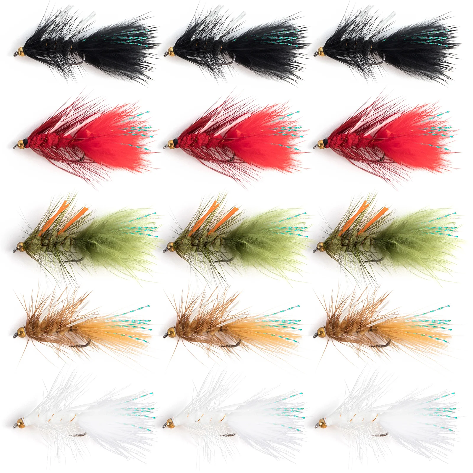 Material duradero: Estos señuelos de pesca con mosca hechos a mano están construidos con plumas de primera calidad e hilo de envoltura de metal, soportando mordeduras feroces y uso abusivo