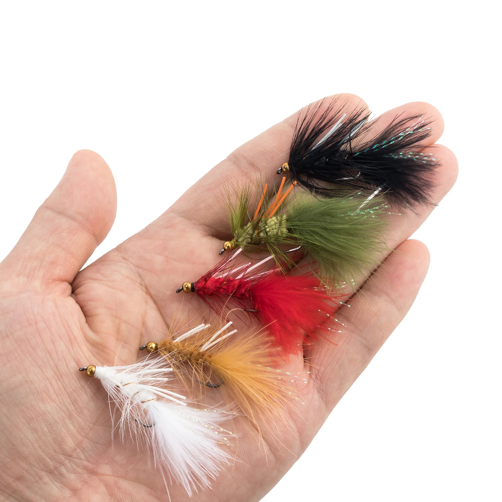Material duradero: Estos señuelos de pesca con mosca hechos a mano están construidos con plumas de primera calidad e hilo de envoltura de metal, soportando mordeduras feroces y uso abusivo