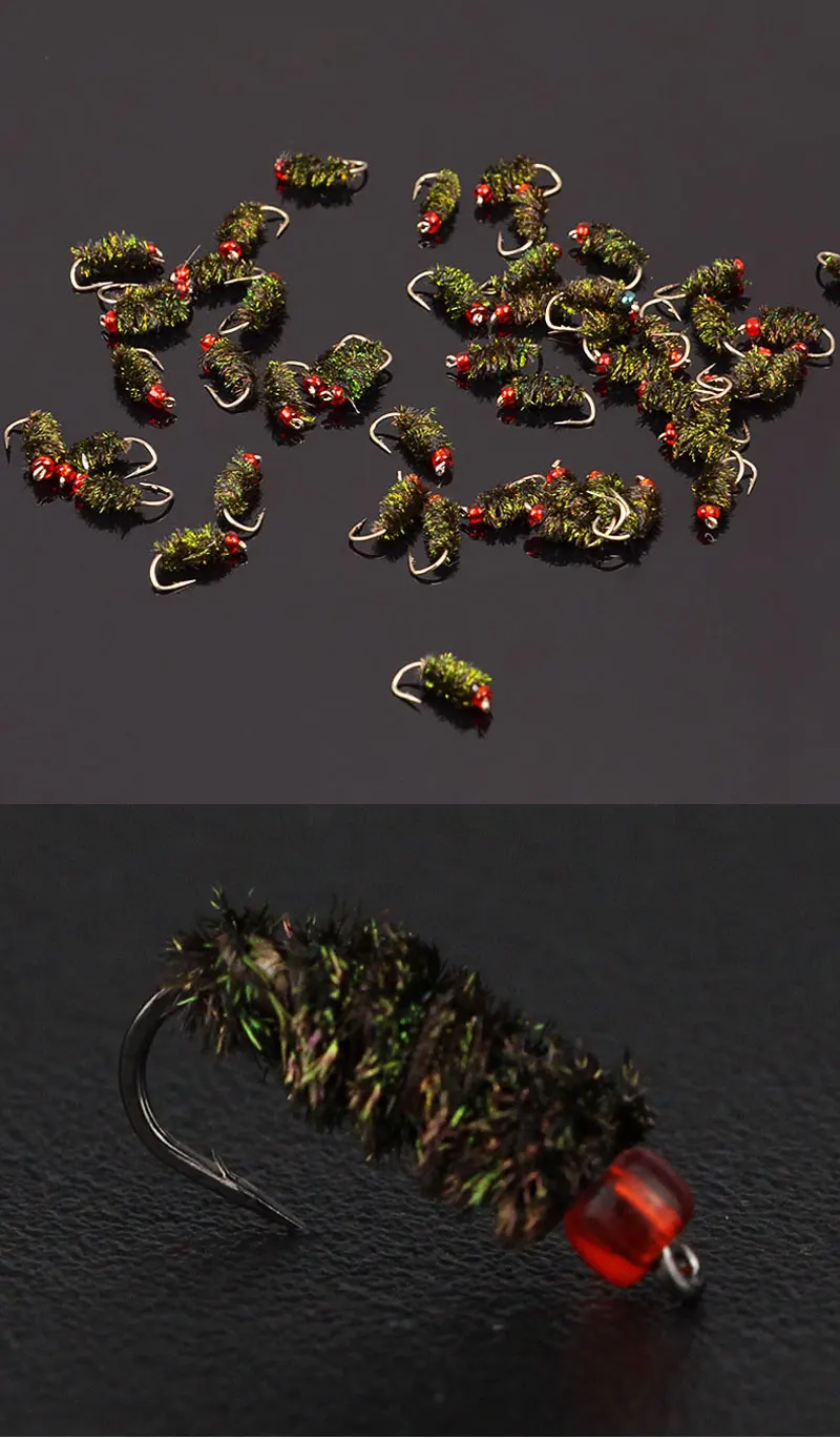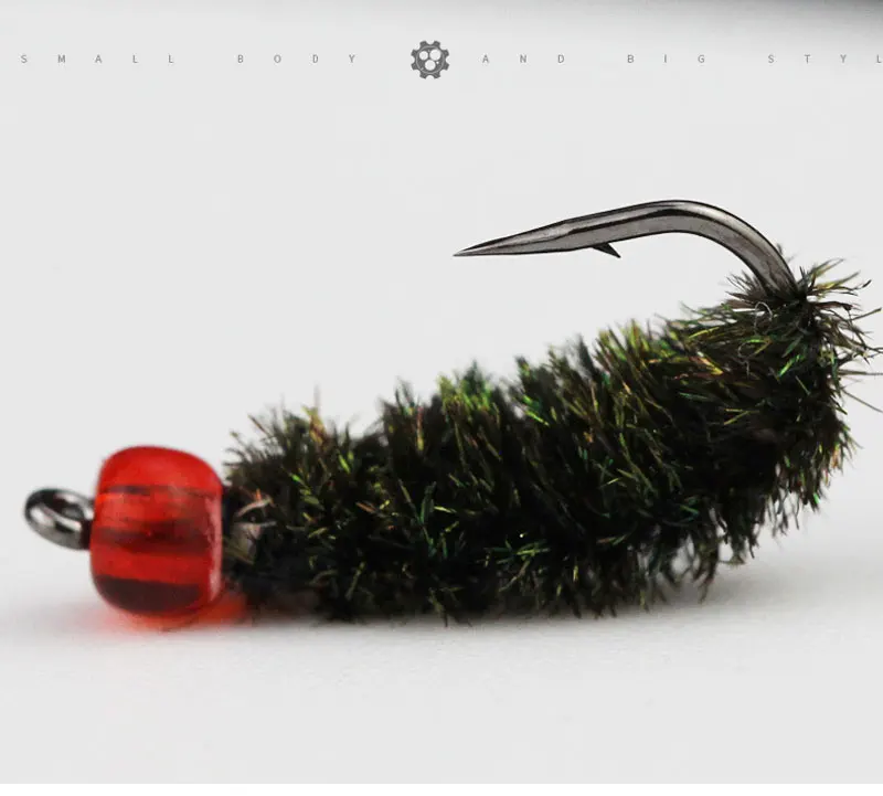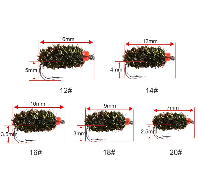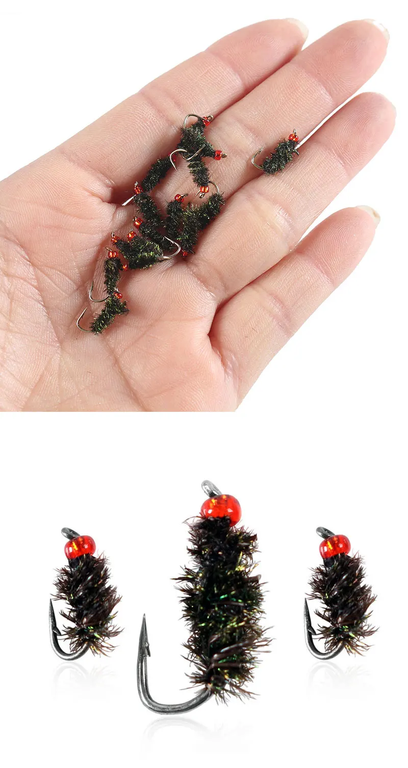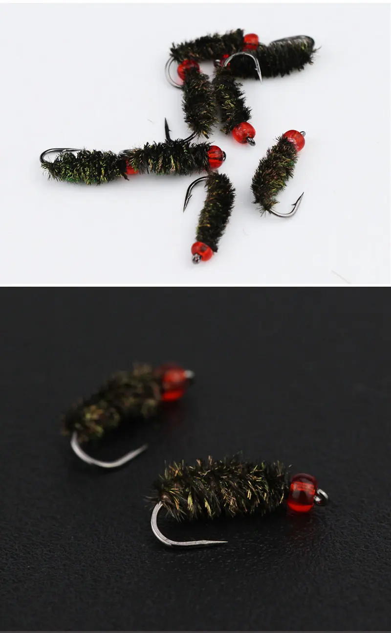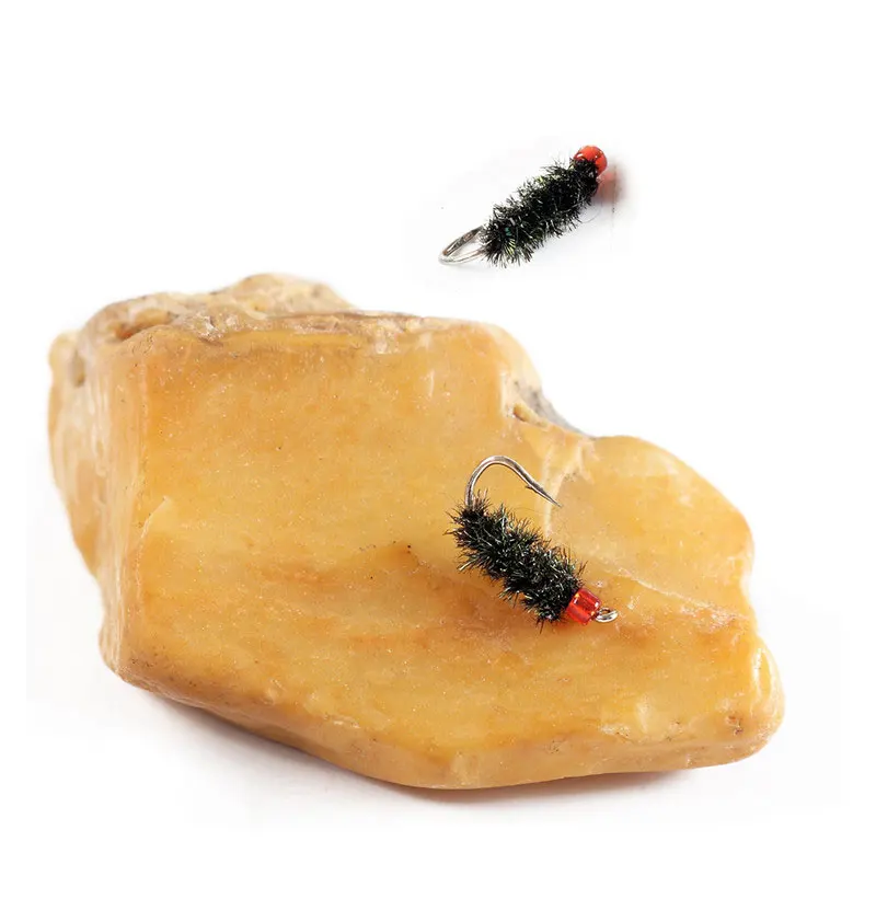 Peces aman las larvas y las larvas: el patrón de moscas es un atractor general que tiene el perfil de larvas, larva y moscas de cuerpo ancho. El collar caliente de colores y el flash crean un interés en los peces que buscan comida. El gancho mantiene el punto del gancho fuera de la parte inferior. El doblaje spikey le da un movimiento realista.