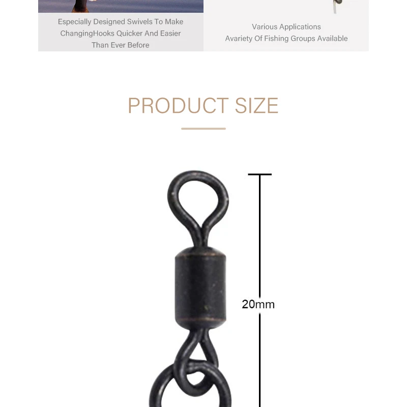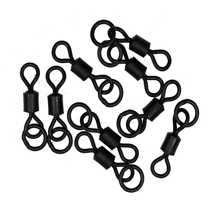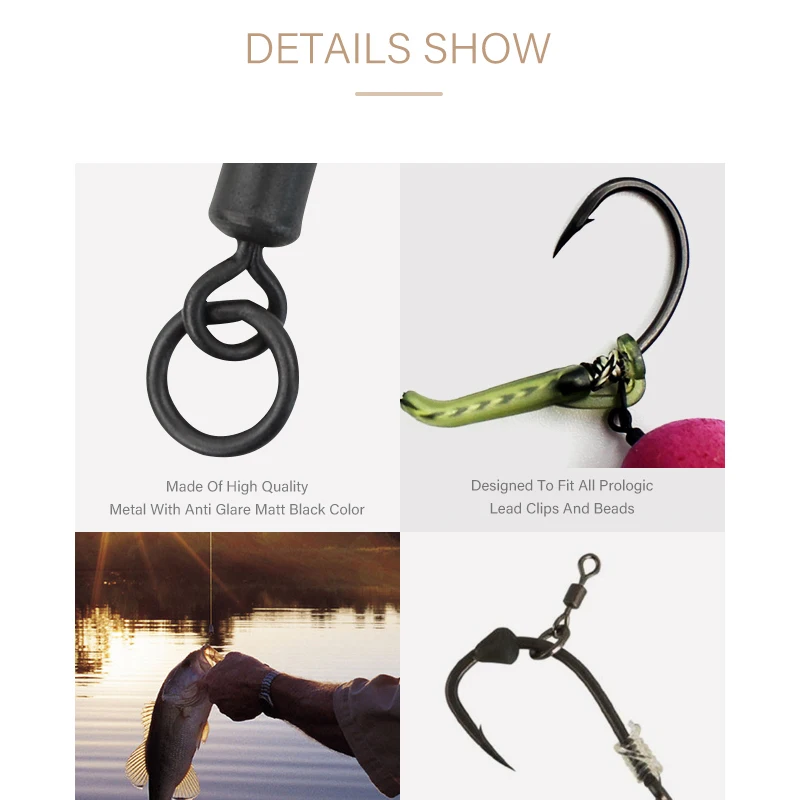 Giratorios para pesca de carpas fabricados en metal de alta calidad con color negro mate antideslumbrante.Diseñado para adaptarse a todos los clips y cuentas de plomo prológicos.Giratorios especialmente diseñados para que cambiar los ganchos sea más rápido y fácil que nunca.Varias aplicaciones, se puede utilizar con rigs rígidos, equipos de equipo y equipos combinados, etc.
