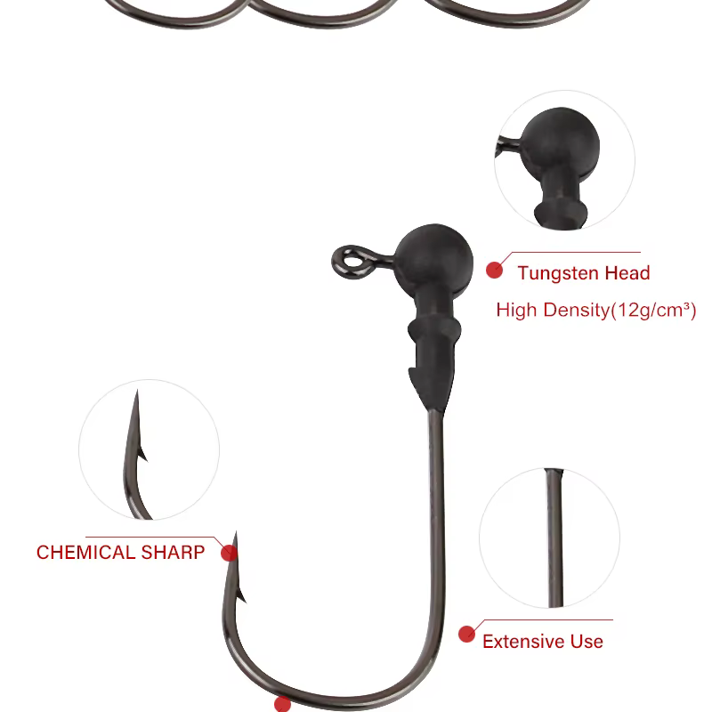 * El gancho de cabeza de plantilla de tungsteno adopta una cabeza de tungsteno de alta calidad, material de acero de tungsteno de Protección Ambiental de estándar internacional, tiene una fuerte resistencia al viento, se hunde más rápido y más estable.