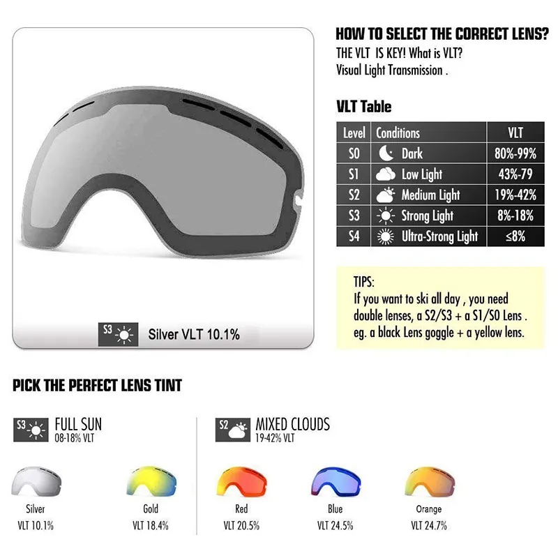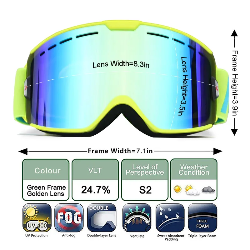 Especificaciones:Color de los cristales: verde amarillo, rojo amarillo, Rosa naranja, azul, PlataTipo de gafas: gafas de esquí profesionalesAtributo óptico de lente: protección UV400, antivaho, a prueba de explosiones, lente de doble capa, revestimiento de espejoTamaño de las lentes: 210x89mm (Ancho x Largo)Material de la lente: PCMaterial de la montura: TPUMultitud adecuada: adultos (hombres y mujeres)El paquete incluye: 1 gafas de esquí; 1 bolsa de telaNota: