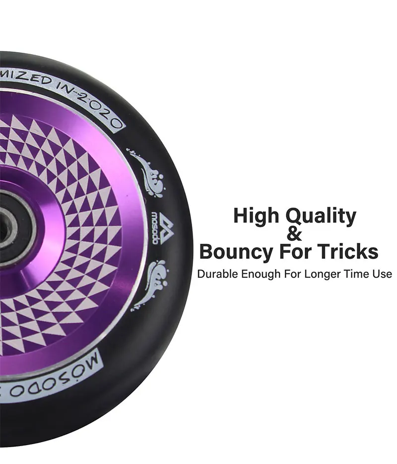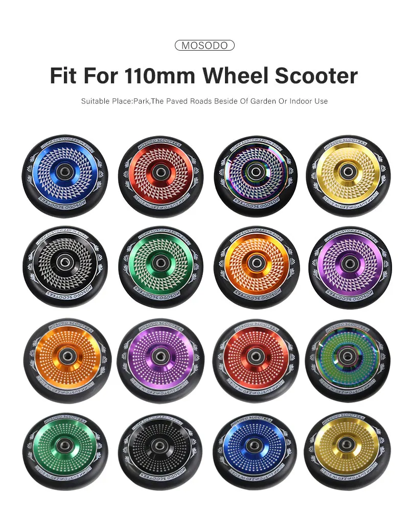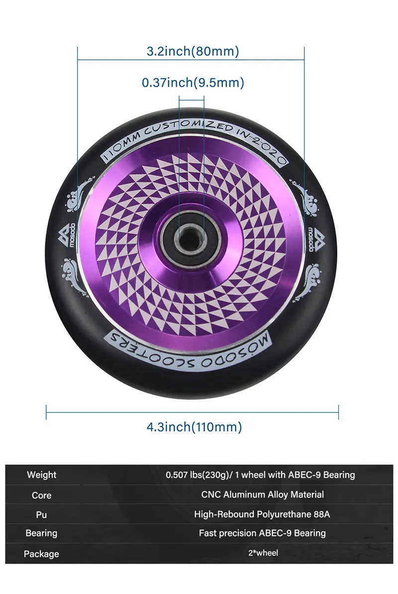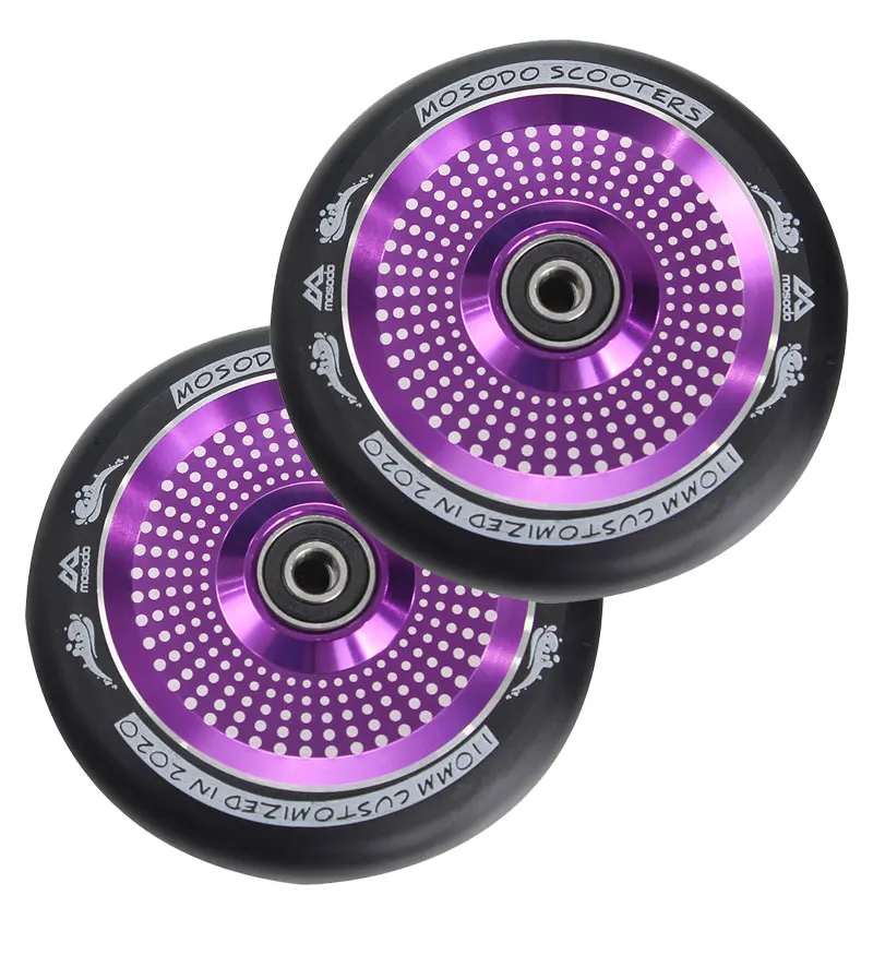 The all new AIR Wheels fromMosodoare one of the lightest wheels on the market!Weighing an ultra light 230grams with bearings the hollowcore technology means you get the strength of twin plate arches with the lightness of air in the inner chamber.Matched with the classic high quality Mosodo PU formula that is known for it's speed and strength so you know you are getting a premium wheel!Professionally pre-fitted with the super fast Mosodo Abec 9 Bearings the new AIR wheels give you high quality and value for money!Specification:Color:Black, Yellow, Orange, Blue, Red, Green, PurpleSize:Diameter 110mm(4.3inch), width 24mm(0.94inch)Core:6063T6 AluminumPU:High-rebound PolyurethaneBearing:ABEC-9Hardness:88A UrethaneResilience:85%Package:2 x wheelNet weight:230g/ wheel approx
