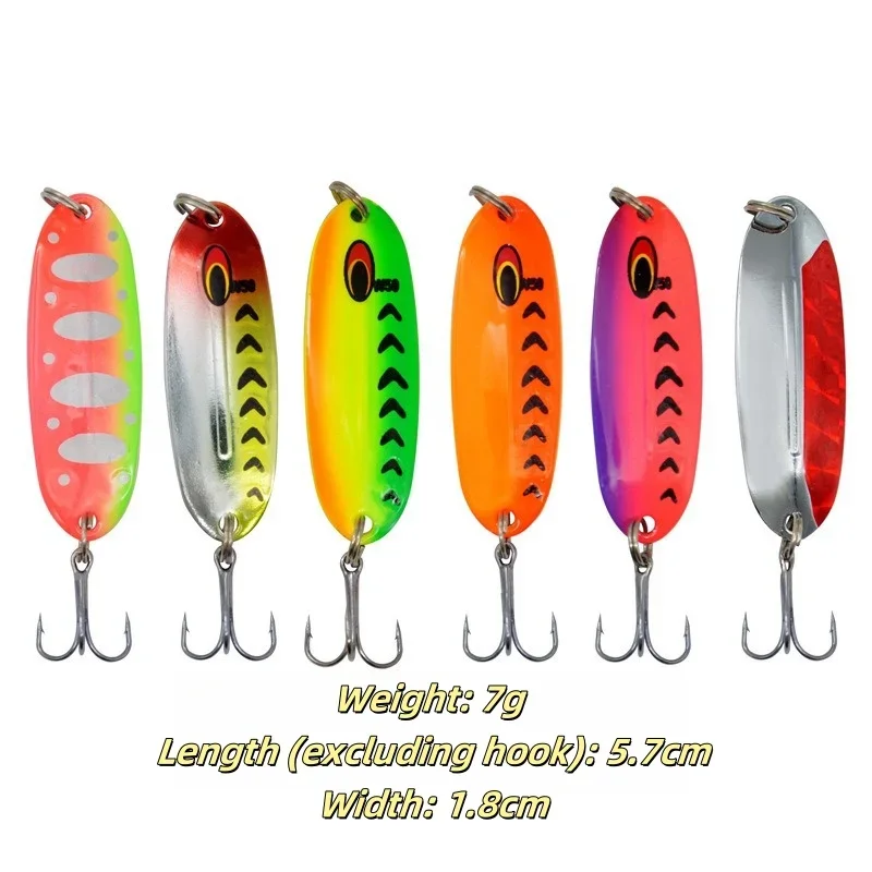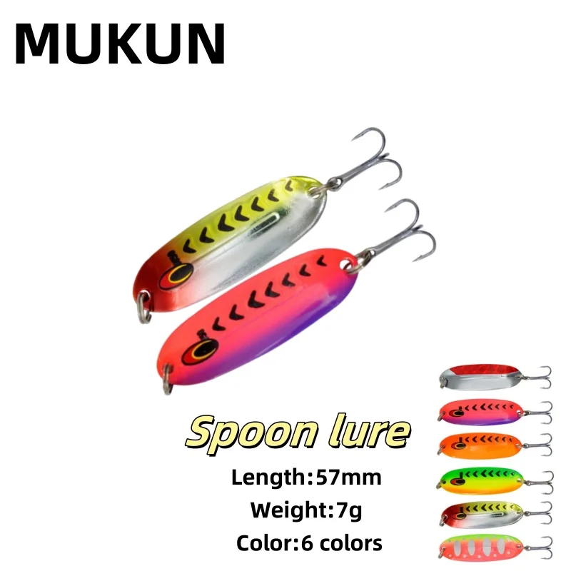 MUKUN, 1 unidad, señuelo cuchara giratoria, 57MM, 7G, cebos duros de Metal, lentejuelas artificiales, Swimbait, anzuelo triple, anzuelo, trucha, Lucio, aparejos de pesca