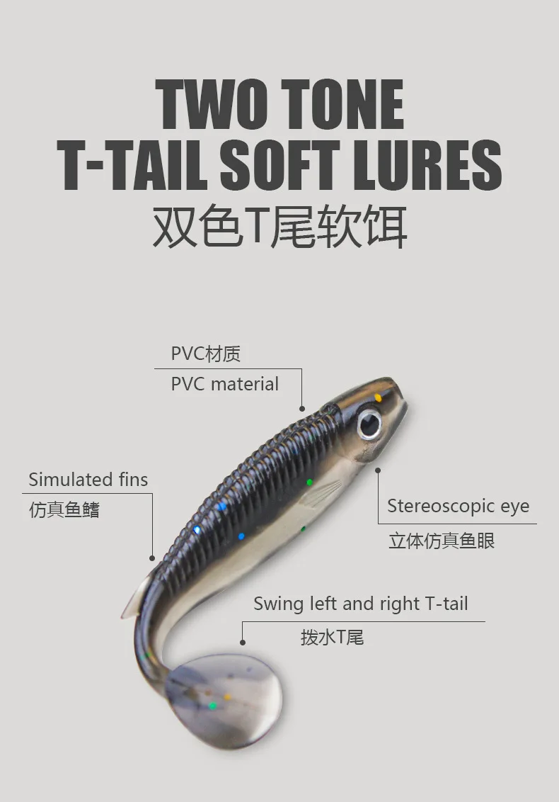 Nombre del producto: cebo suave de dos colores con cola en TTamaño del producto: 6,5 cmPeso del producto: 2,8 gMaterial del producto: PVCColor del producto: un total de 6 colores para elegir