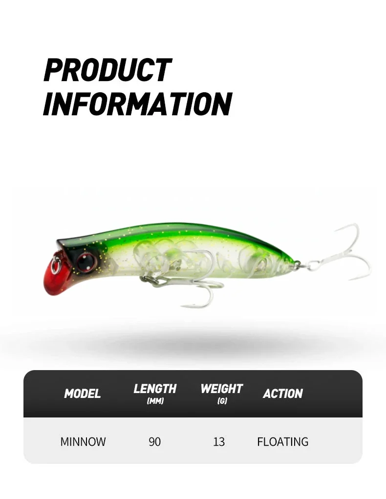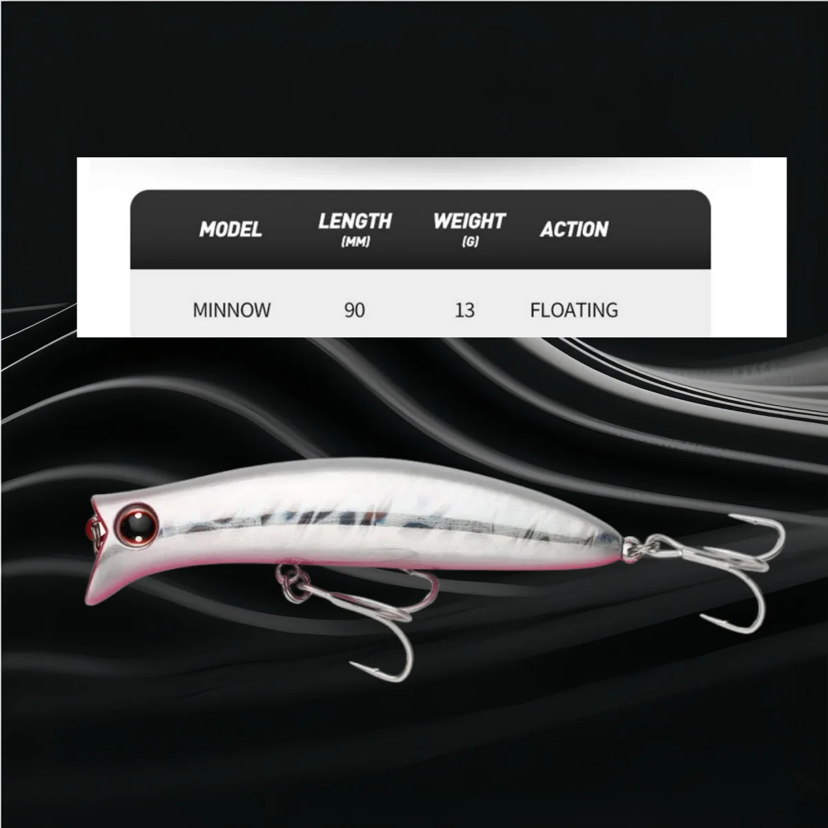 Tipo de señuelo: MinnowPeso del señuelo: 13 g/14,5 gLongitud del señuelo: 90 mm/115 mmGanchos: Equipado con 2 ganchosOjos: ojos de pez 3DCaracterísticas del producto: