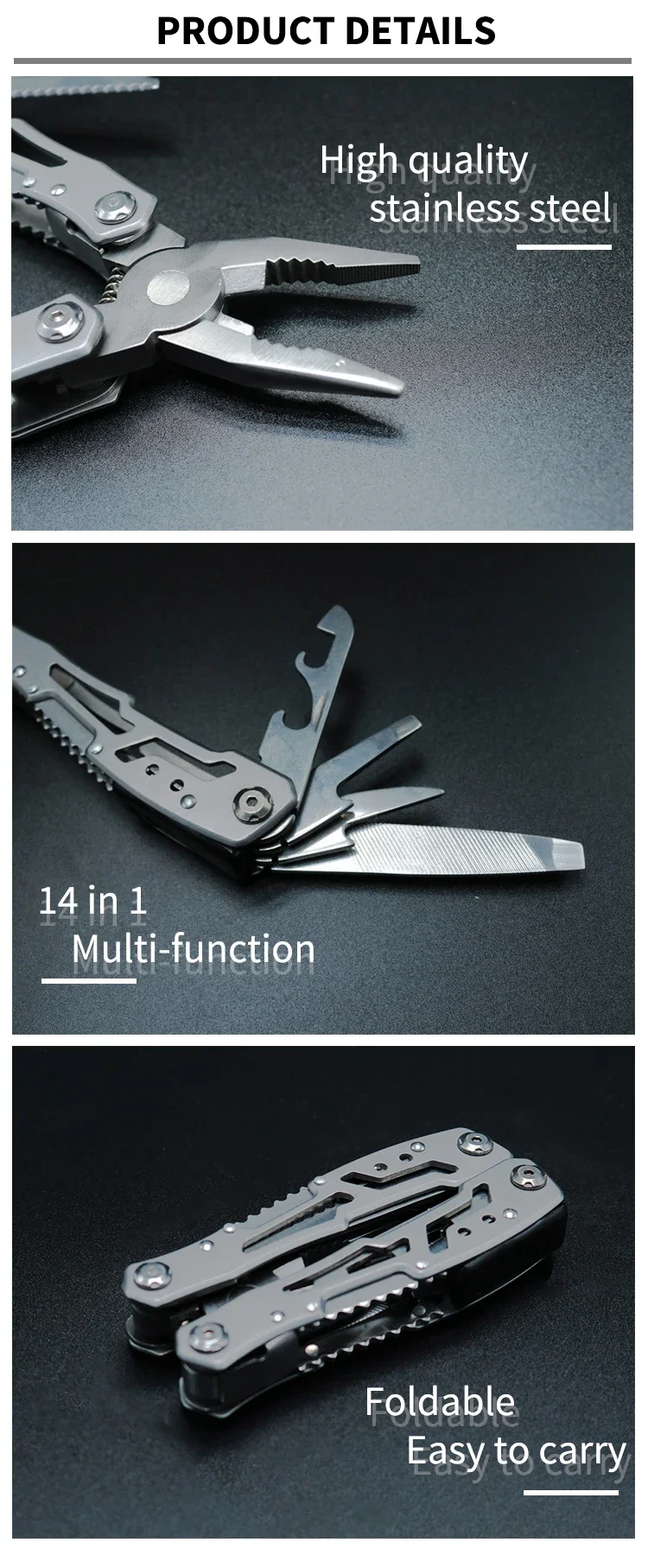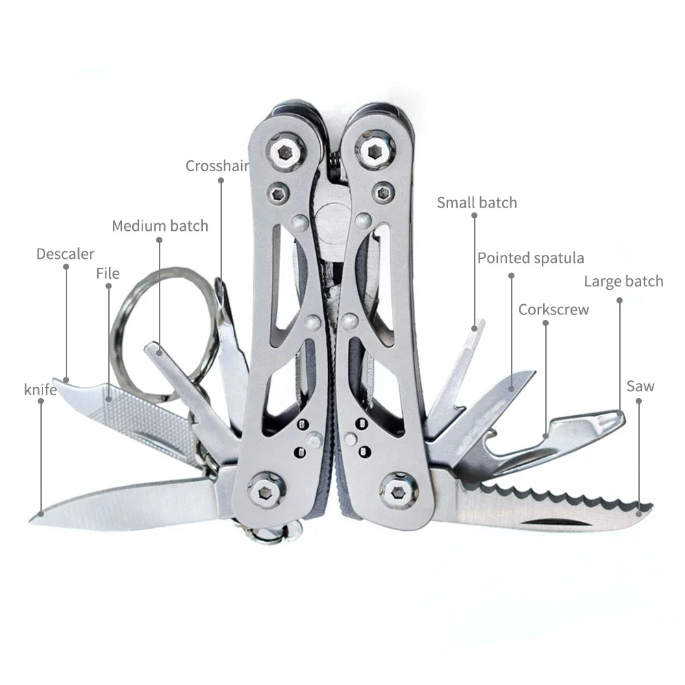 1. Alicates (Alicates de punta de aguja, alicates de tubo redondo, alicates de corte) 2. Cuchillo 3. Destornillador de Cruz 4. Destornillador ranurado pequeño 5. Cuchillo de escamas de pescado 6. Separador 7. Lima de doble cara 8. Destornillador ranurado grande 9. Raspador 10. Destornillador ranurado medio 11. Abrelatas 12. Abrebotellas