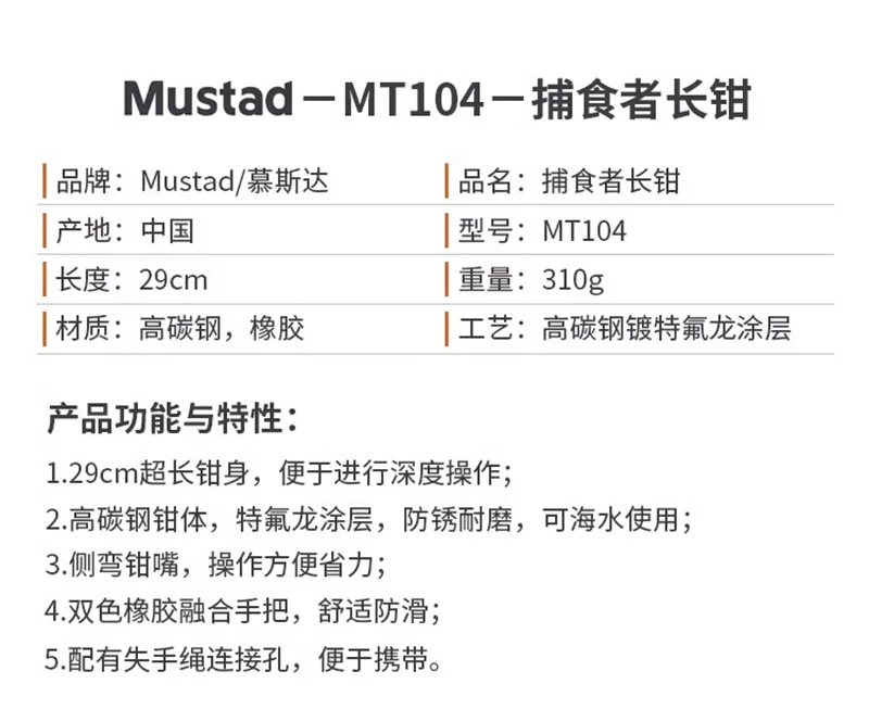 Mustad MT104 Predator alicates largos multifuncionales de acero inoxidable, alicates de pesca Yahai de carretera, gancho de recogida