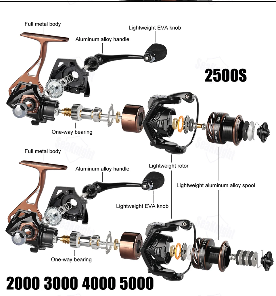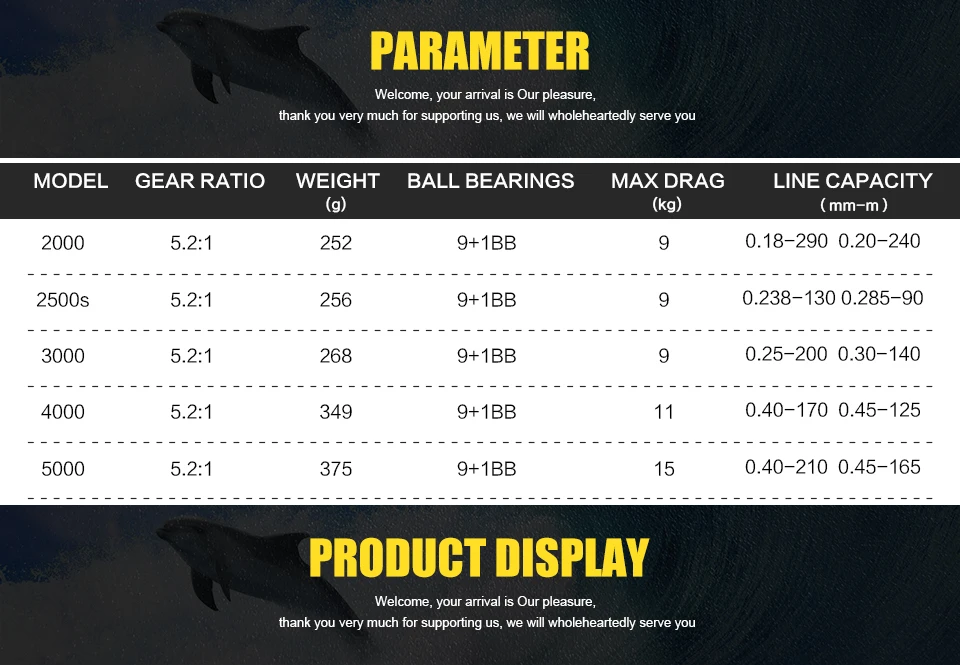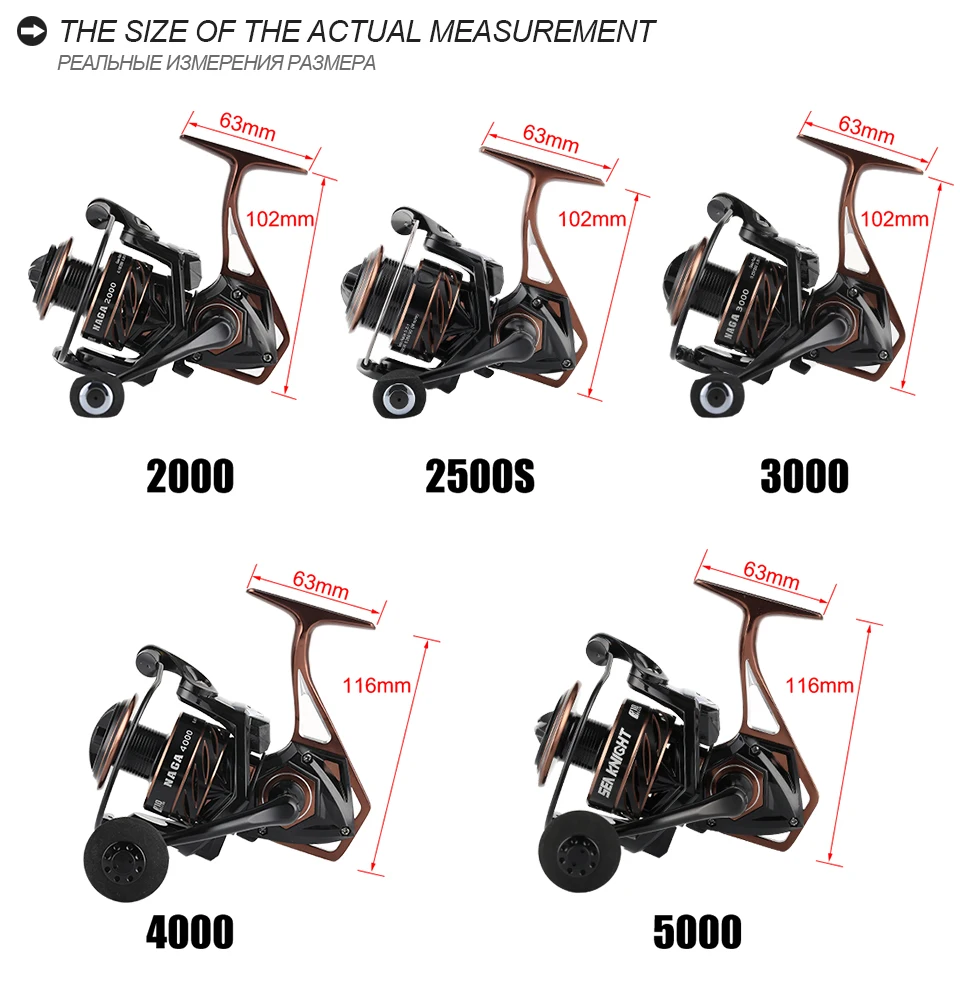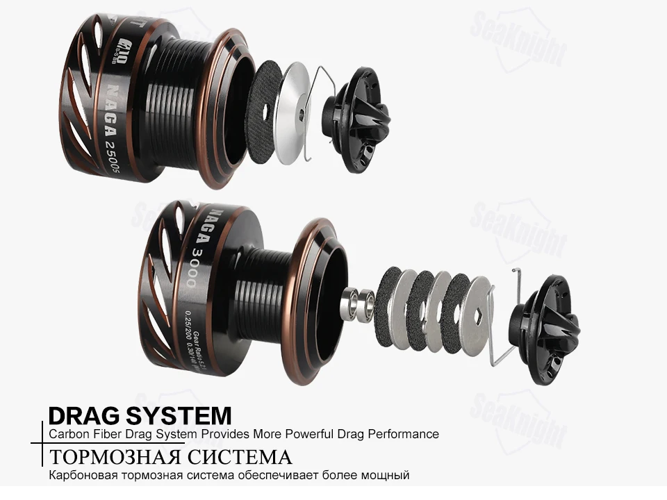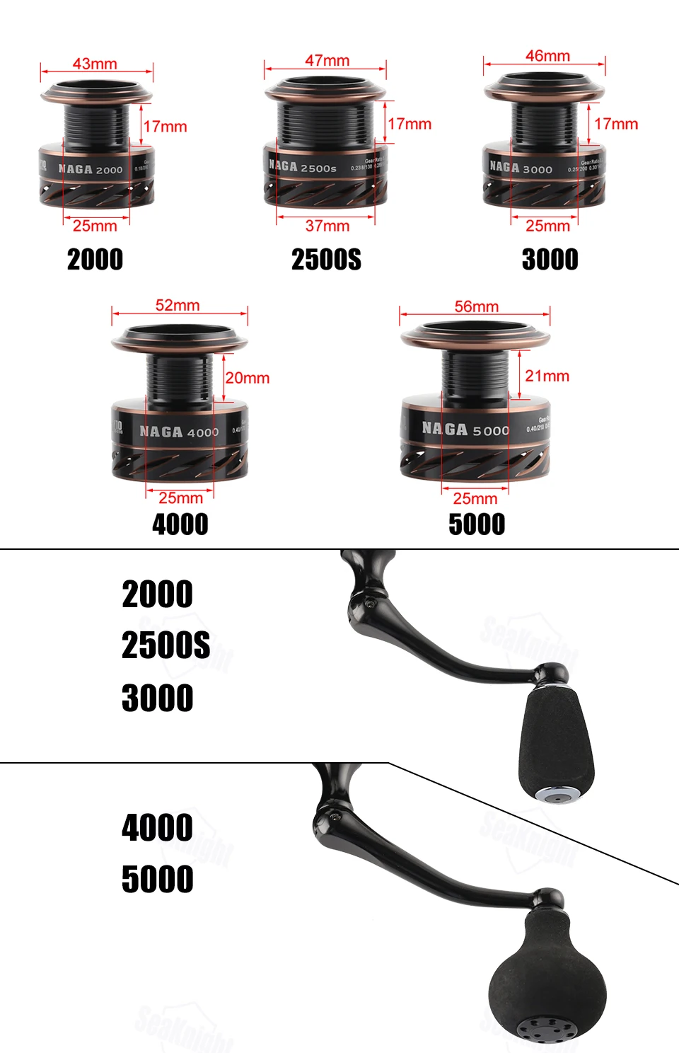 NAGA II 2500S | Peso: 256g | Relación de engranaje: 5,2: 1 | Rodamiento: 10BB | Arrastre máximo: 9KG | Capacidad de línea (mm-M): 0.238-130 0.285-90