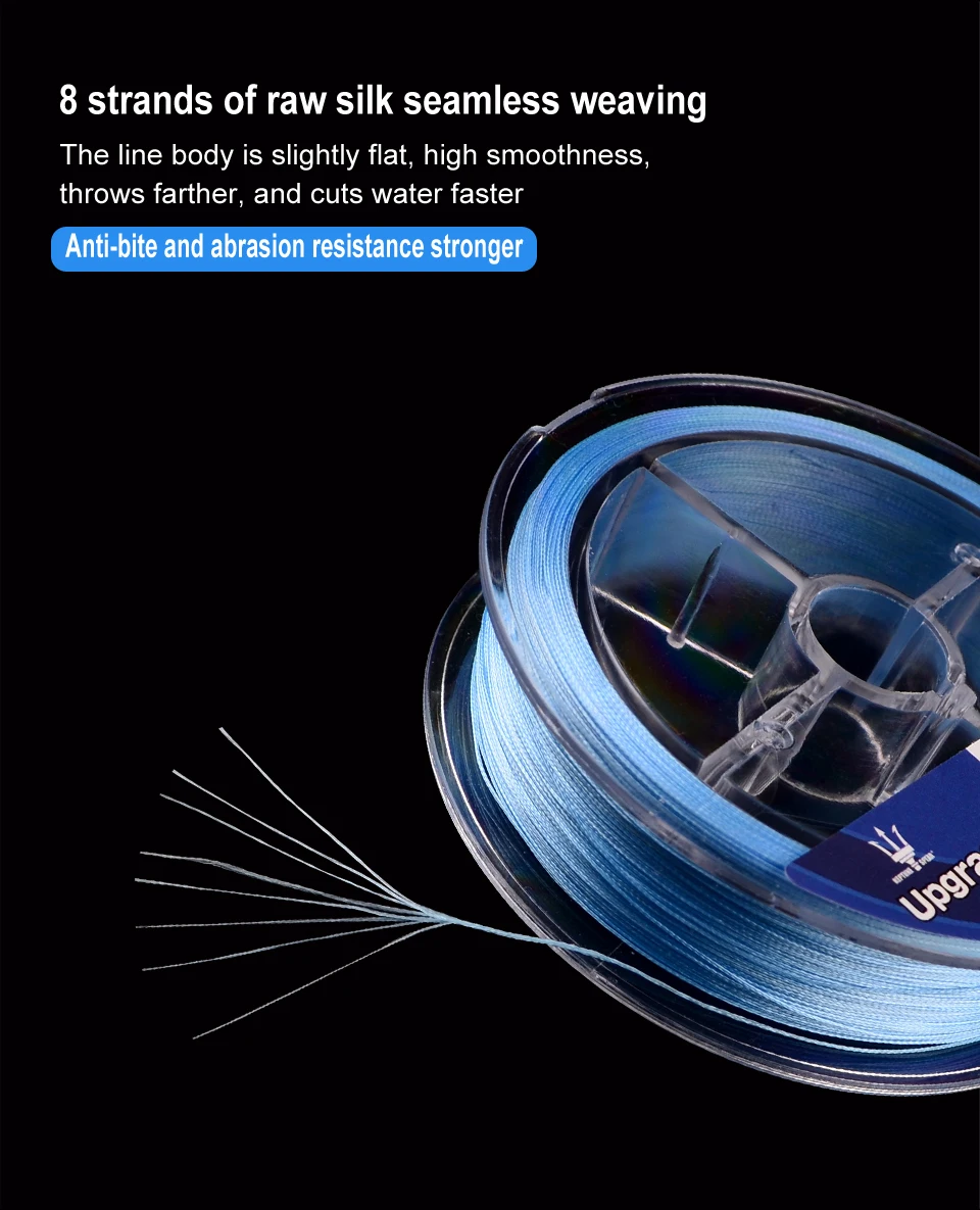 La línea de actualización Neptune Spear X8 tiene el material trenzado más avanzado por la tecnología más avanzada para ofrecer una gran línea. Tiene una superficie lisa y el diámetro de línea más pequeño. Emplea el filamento más avanzado, Ultra 2 PE, para lograr aproximadamente un 40% más de resistencia máxima en comparación con las líneas trenzadas spectra estándar. La tecnología de trenzado Neptune Spear X8 hace la línea con el cuerpo de línea menos elástico y más ajustado. El cuerpo de 8 hebras ofrece la superficie de línea más suave. Es muy adecuado para lanzar con carretes giratorios y jigging para la pesca de altura. La calidad está probada.