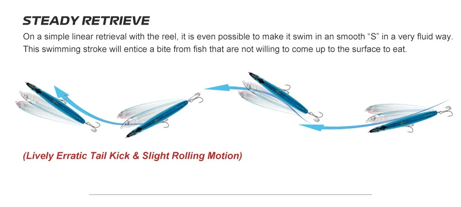 Durante la fase de hundimiento, el señuelo tiene una acción oscilante seductora y brilla sobre la gota, imitando naturalmente a un pez cebo moribundo y llamando la atención del atún desde considerable distancia.