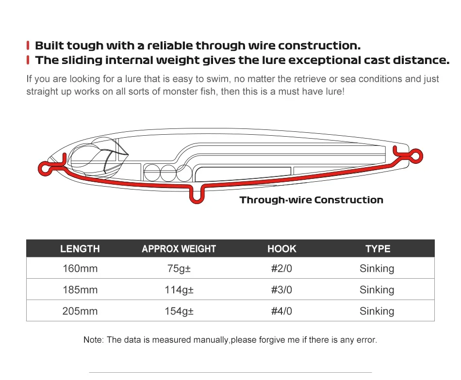 Noeby Sinking Stickbait Señuelo de pesca 160 mm 75 g ± 185 mm 114 g ± 205 mm 154 g ± Lápiz reforzado Señuelos de pesca de mar con cebo duro artificial