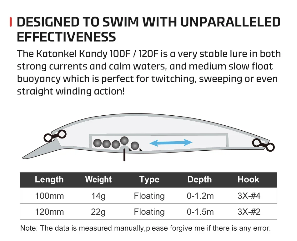 ¡El Katonkel Kandy 100F / 120F es un señuelo muy estable tanto en corrientes fuertes como en aguas tranquilas, y en flotabilidad de flotación lenta media que es perfecto para la acción de contracción, barrido o incluso de bobinado recto!
