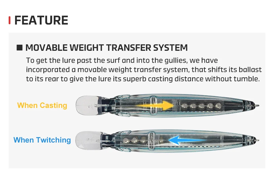 Para pasar el señuelo por el surf y entrar en los gullies, hemos incorporado un sistema de transferencia de peso móvil, que desplaza su balastro hacia atrás para darle al señuelo su excelente distancia de lanzamiento sin tumbar.