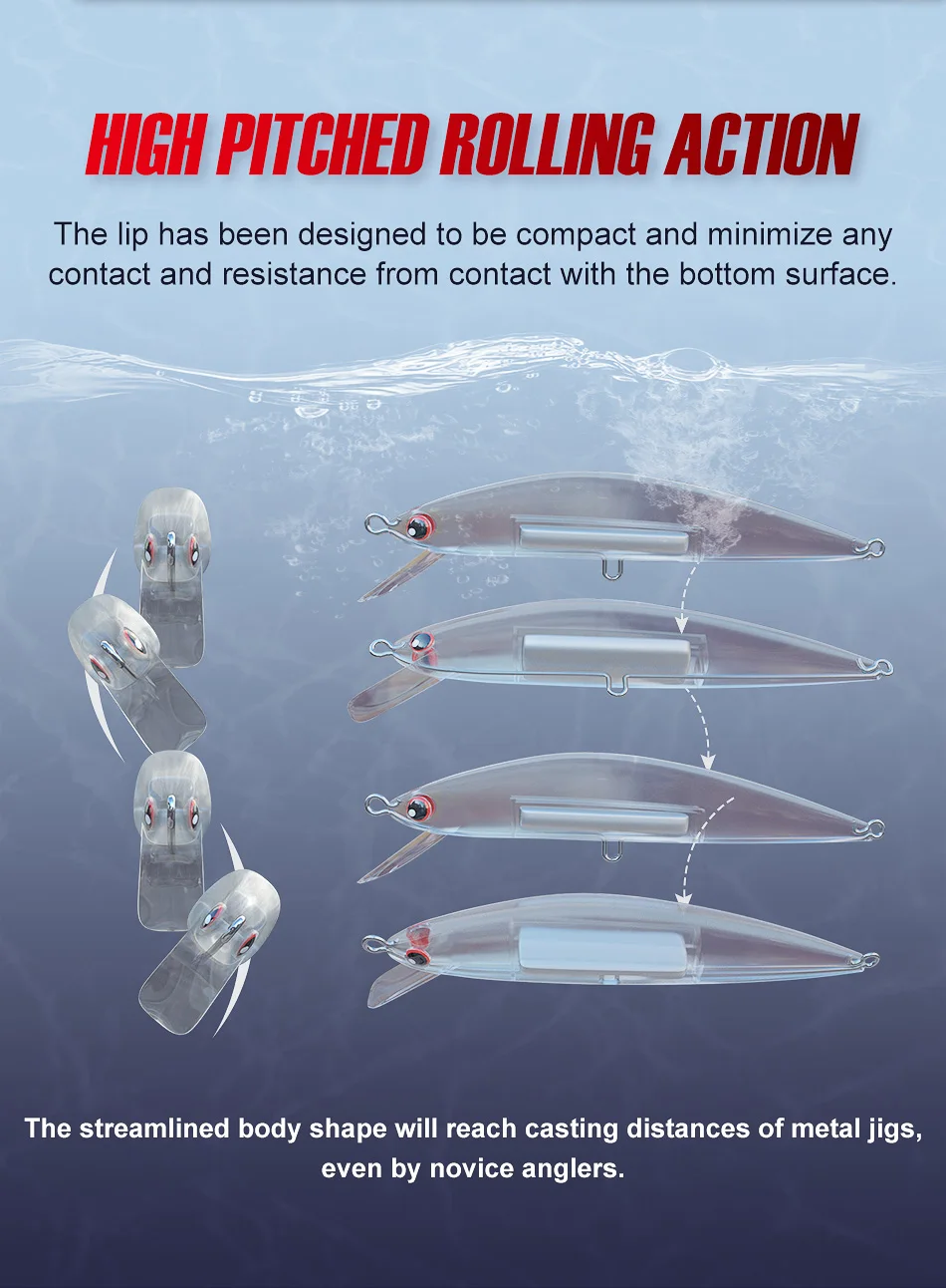lt is "Super Sinking" which is designed for fast retrieve with long cast ability. Fast retrieve and long length dart action by continuous jerks attracts wide range of fish.