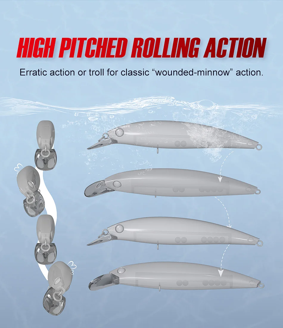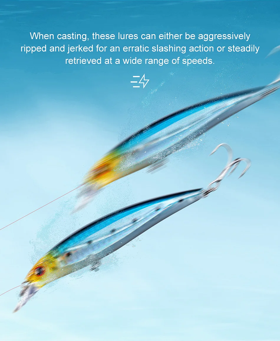 Al lanzar, estos señuelos pueden rasgarse y tirarse agresivamente para una acción de corte errática o recuperarse de manera constante a una amplia gama de velocidades.