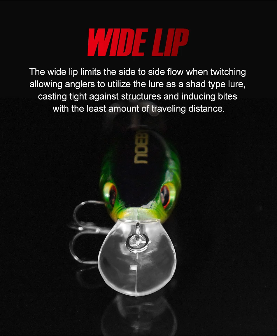 The wide lip limits the side to side flow when twitching allowing anglers to utilize the lure as a shad type lure, casting tight against structures and inducing bites with the least amount of traveling distance.