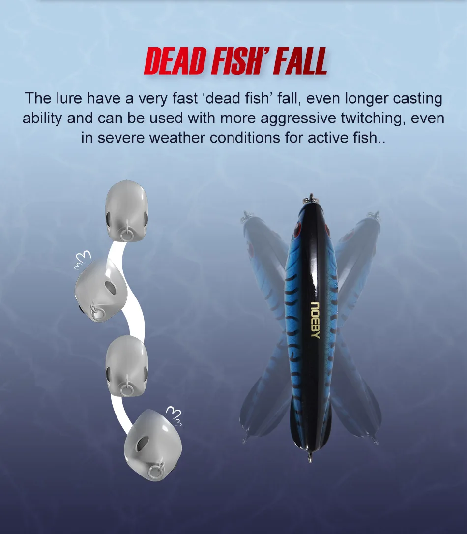 El señuelo tiene una caída muy rápida de "peces muertos", capacidad de lanzamiento aún más larga y se puede utilizar con espasmos más agresivos, incluso en condiciones climáticas adversas para peces activos.