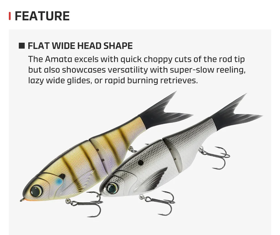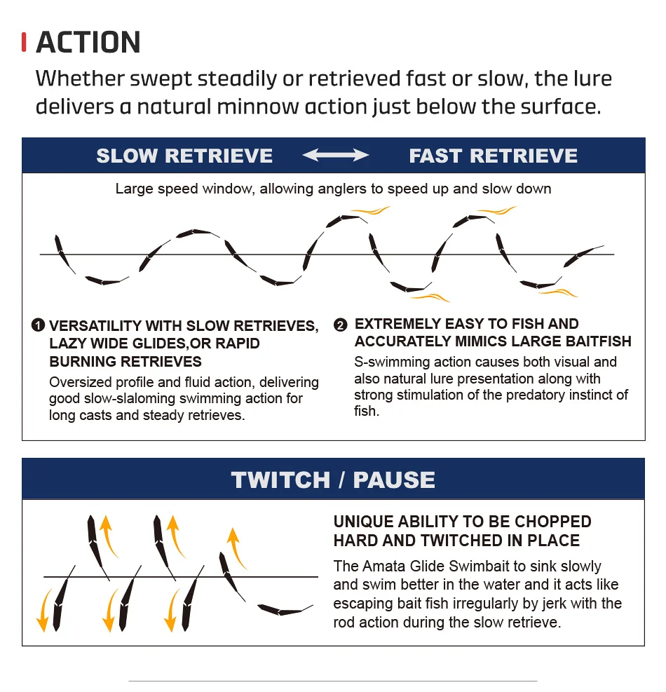 Amata Glide Swimbait para hundirse lentamente y nadar mejor en el agua y actúa como escapar de peces cebo de manera irregular al jerk con la acción de la caña durante la recuperación lenta.