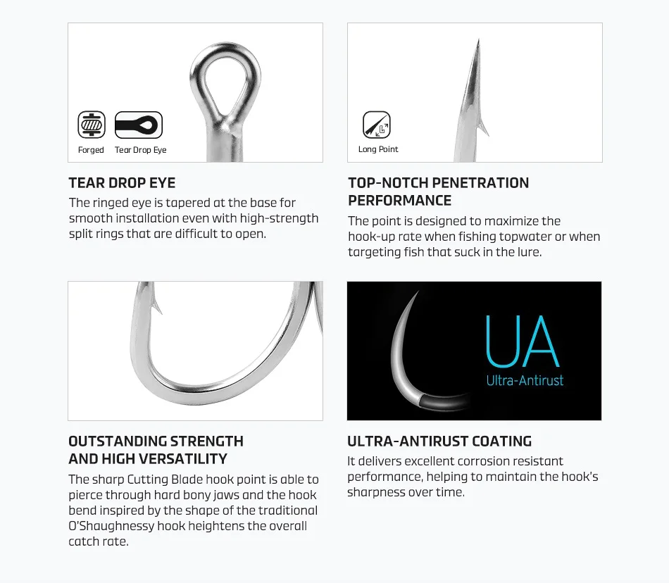 La punta afilada del anzuelo de la cuchilla de corte es capaz de perforar mandíbulas óseas duras y la curvatura del anzuelo inspirada en la forma del gancho tradicional O'Sharnessy aumenta la tasa de captura general.