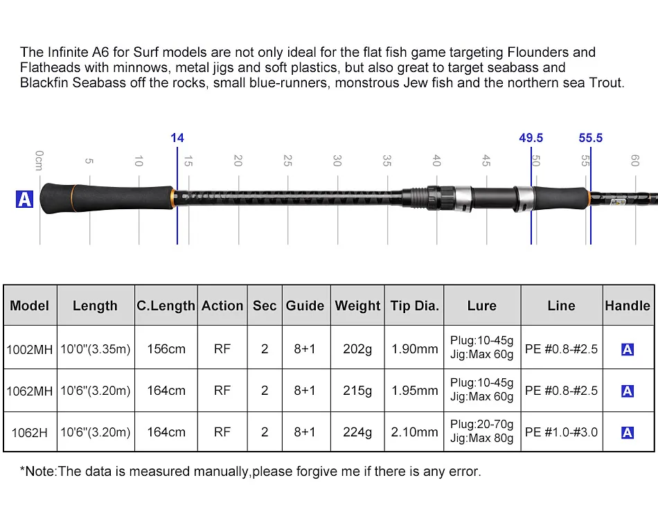Infinite A6 surf es una caña de surfcasting con un concepto totalmente diferente en comparación con la serie de marabass A6.El modelo de surf A6 es más tenaz, flexible y tiene cuerpo.