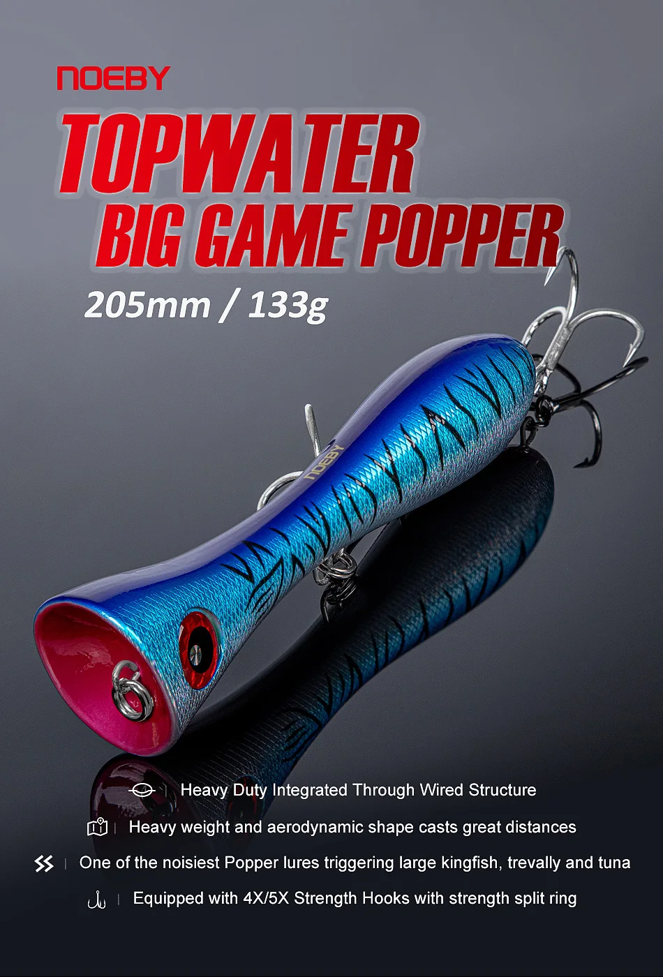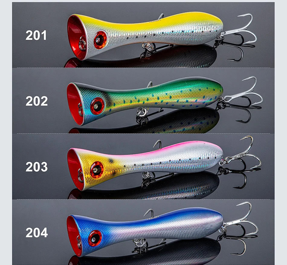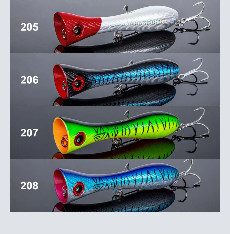 El señuelo se asienta verticalmente en el agua y con un ligero movimiento de la punta de la caña, el popper se enrosca hacia adelante, lo que permite que su enorme cabeza cóncava rocíe un gran volumen de agua hacia adelante, lo que resulta en un ruido sanguíneo muy fuerte.