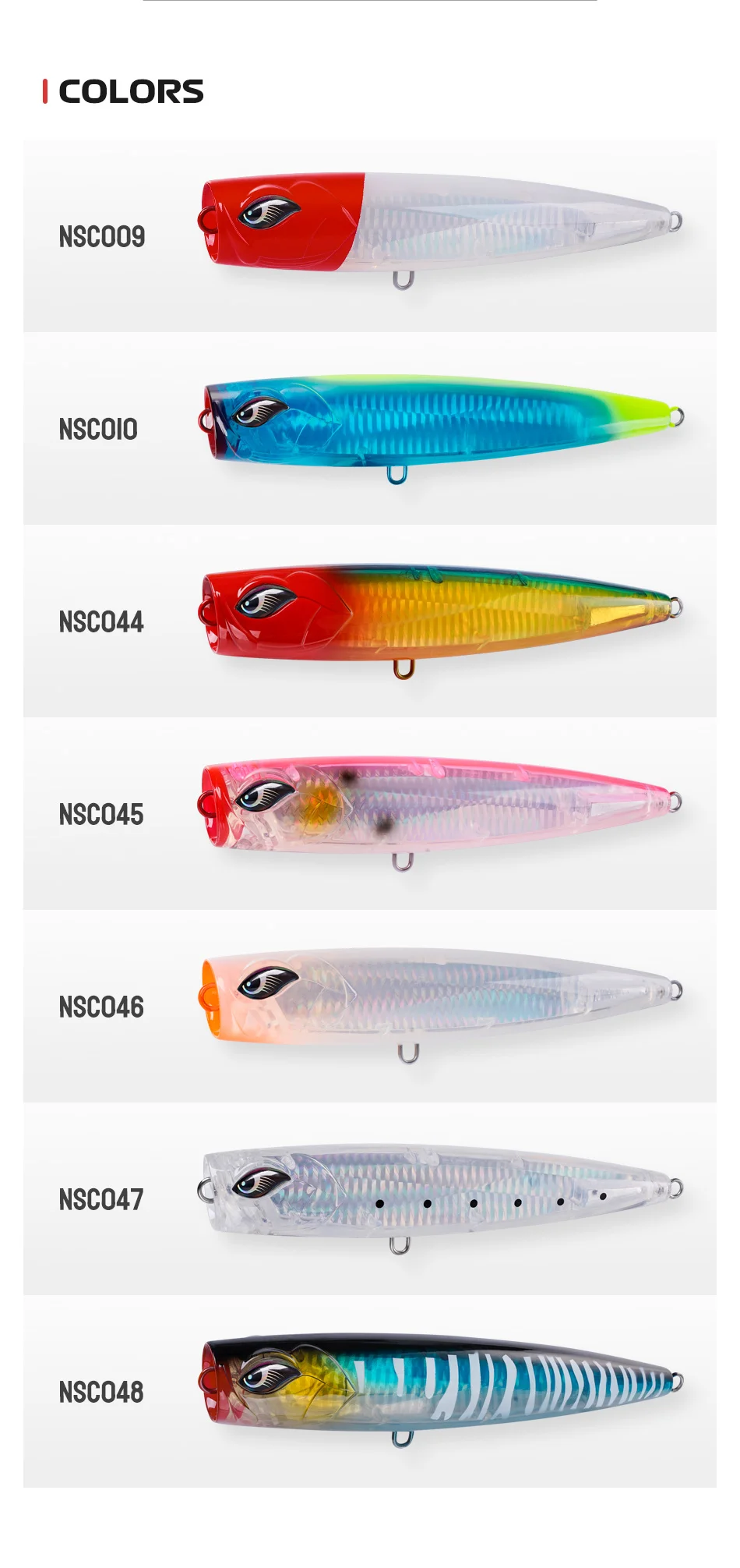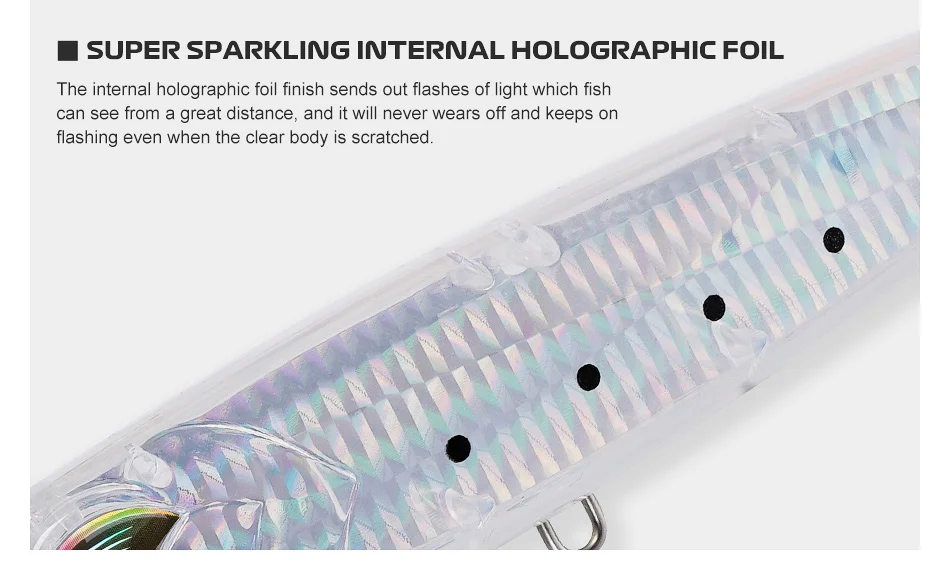 El acabado de lámina holográfica interna envía destellos de luz que los peces pueden ver desde una gran distancia, y nunca se desgastará y sigue parpadeando incluso cuando el cuerpo transparente está rayado.