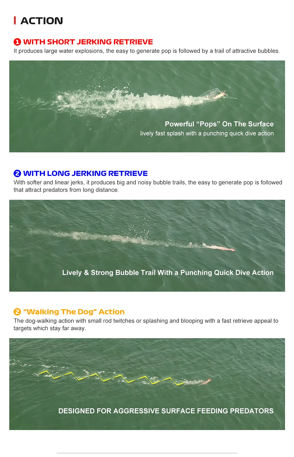 Con tirones más suaves y lineales, produce rastros de burbujas grandes y ruidosos, se sigue el pop fácil de generar que atrae a los depredadores desde larga distancia.