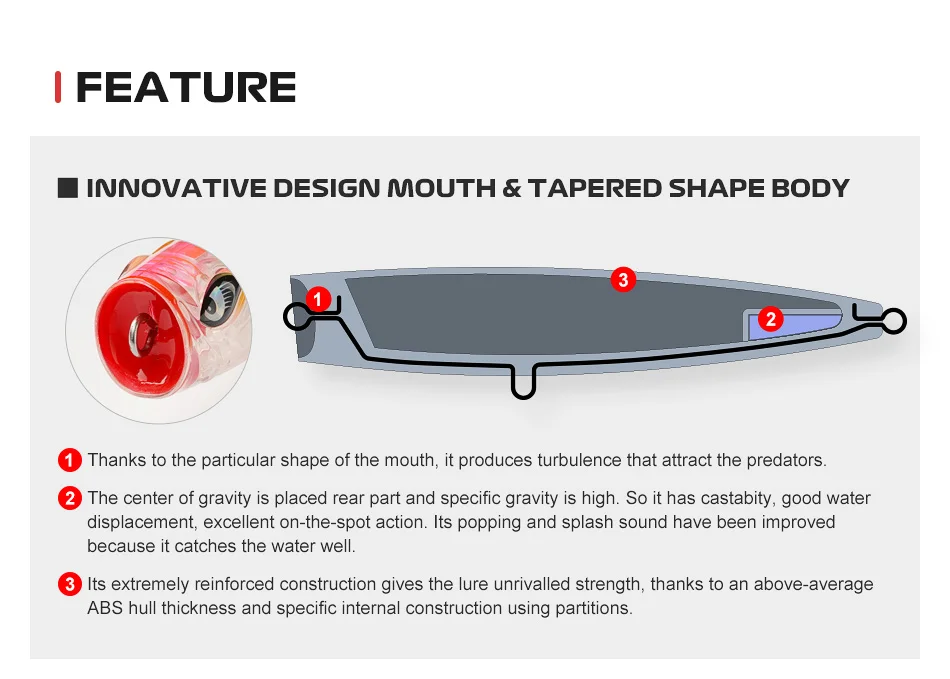 Su forma larga y su sección transversal en forma de huevo hacen que este señuelo sea fácil de usar, permitiéndole disfrutar de todo su potencial tanto en acción de Popper como de pasear al perro.