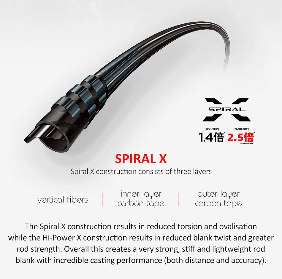 La construcción Spiral X da como resultado una reducción de la torsión y La ovalización, mientras que la construcción Hi-Power X da como resultado una reducción del giro en blanco y una mayor resistencia de la varilla. En general, esto crea una barra en bruto muy fuerte, rígida y ligera con un rendimiento de fundición increíble (distancia y precisión).