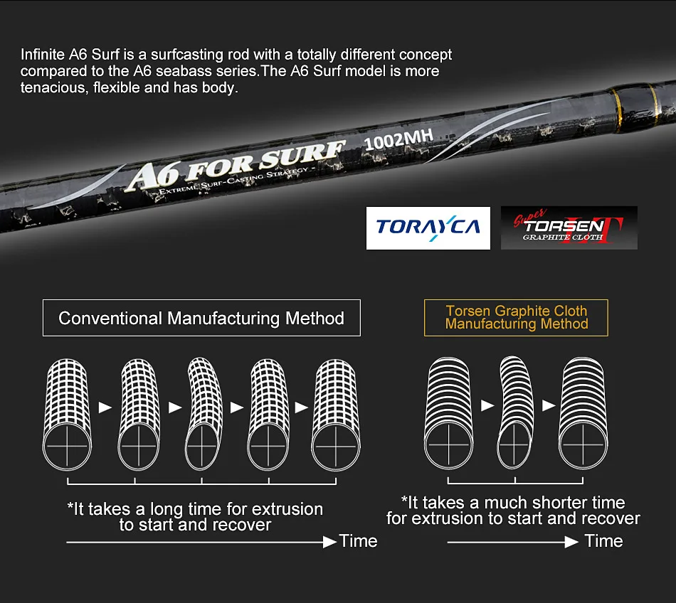 Infinite A6 Surf es una caña de surf con un concepto totalmente diferente en comparación con la serie de lubina A6. El modelo de surf A6 es más tenaz, flexible y tiene cuerpo.