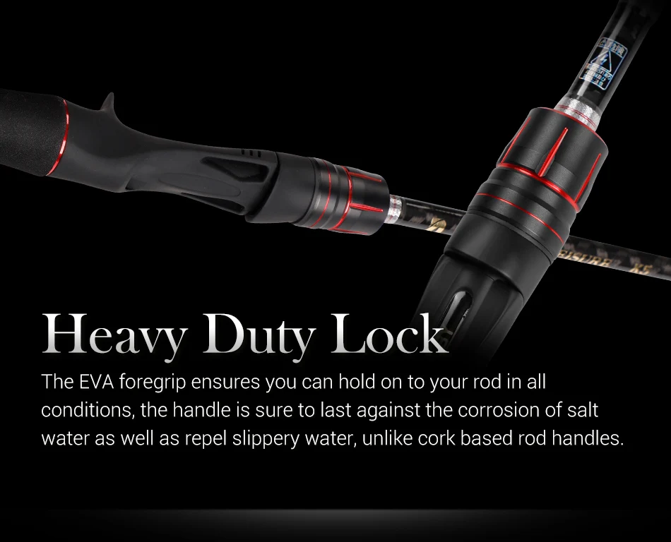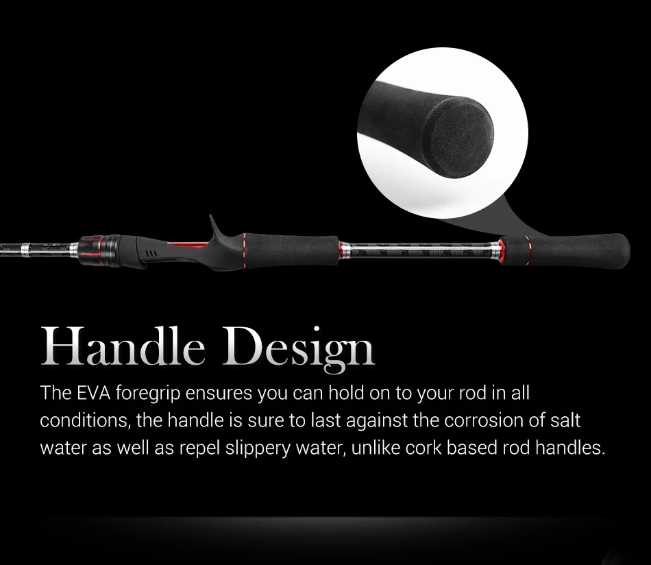 La empuñadura de EVA garantiza que pueda sujetar su varilla en todas las condiciones, el mango es seguro para durar contra la corrosión del agua salada, así como para repeler el agua resbaladiza, a diferencia de los mangos de varilla a base de corcho.